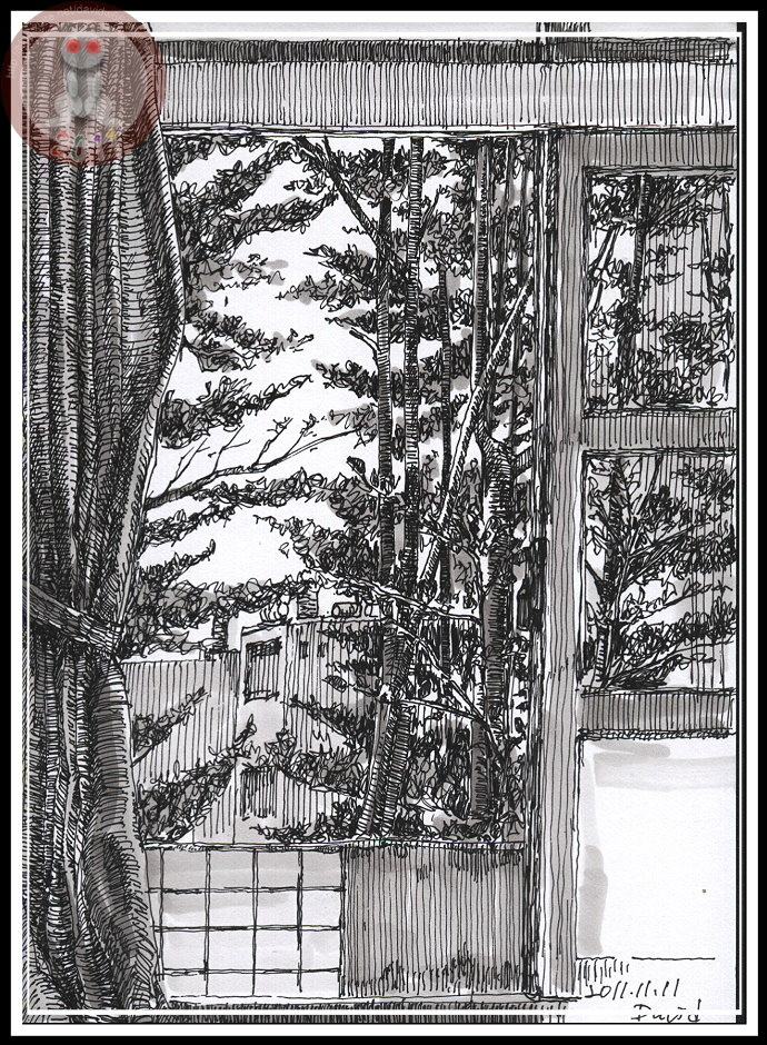 固定的時間彙報、計畫行事,坐在同樣的位置,壓力漸漸地被麻痺,然後習慣耳朵拉長、思緒飄到窗外...手中的筆迅速地挪移。窗外的細葉欖仁二十歲了,因為縣市改制合併,原來免費到學校服務的工務團隊也被裁撤,這幾個月樹枝越長越密。夏末,天氣好的時候,斑鳩就在枝椏分叉處築巢,我在裡面開會,牠們竟然就在那兒演活春宮、上演養兒育女的倫理大喜劇。秋初,我發現...簡單的筆...真是偷渡時間的好方法。