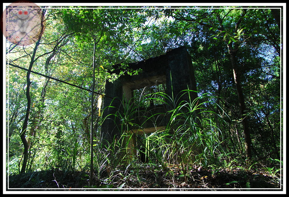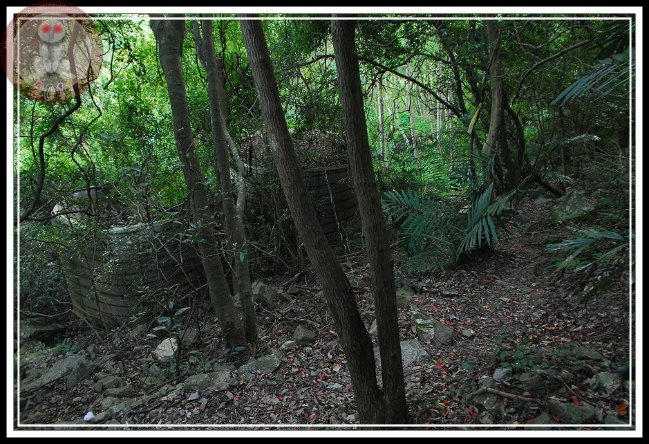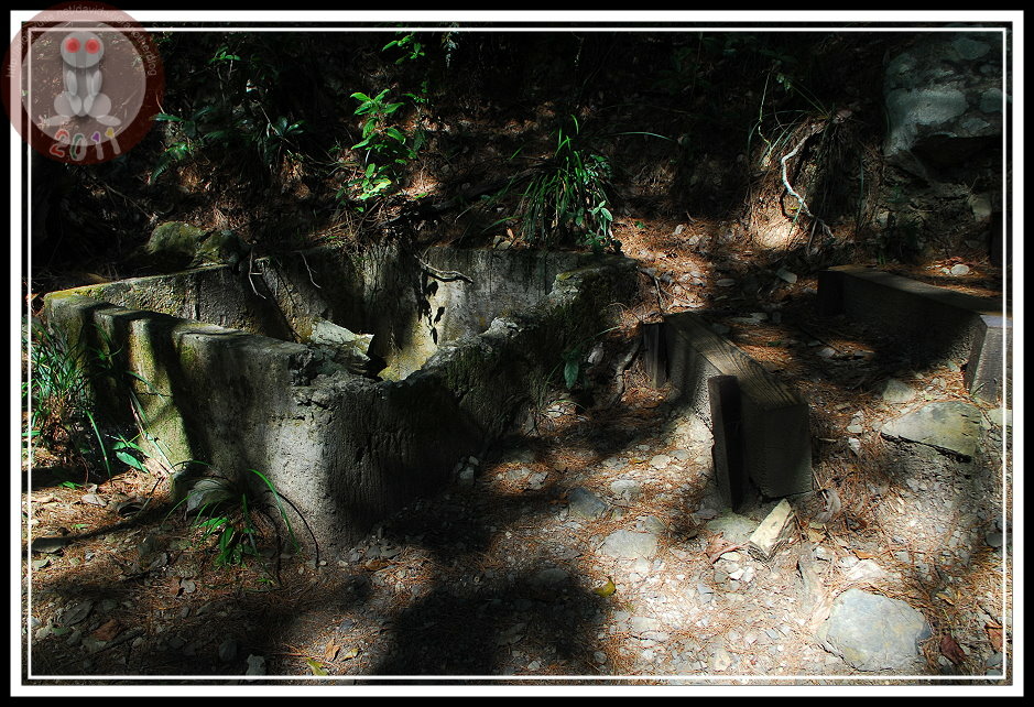 花了20分鐘從乾河床走到1.5K里程碑,發現了第一處散兵坑,根據登山口的草圖,散兵坑是在半山腰上。其實,由這裡往上直到接近山頂還可以遇見幾處散兵坑,有些已經被石塊、落葉填滿,有些則依舊乾乾淨淨...要不是圖上說他是散兵坑,我還以為是先民留下來小小蓄水槽。