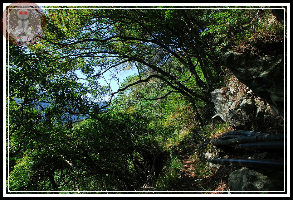 也因為出發時的懸疑氣氛,這屋我尾山...似乎一直籠罩在詭譎的氣氛之中。其實,路跡算是明顯,只是「路況不佳」。從十文巷花5分鐘到登山口,再由登山口花3分中走到「兩座大水塔」,步道開始上切...拉著繩子上切...。原來,路基不明顯不是因為坍方隱沒...而是路站起來了,可以供人行走的部分就剩下外凸的岩石。尤其久旱之後,碎石與泥沙都鬆軟,一個不留神很容易滑倒。