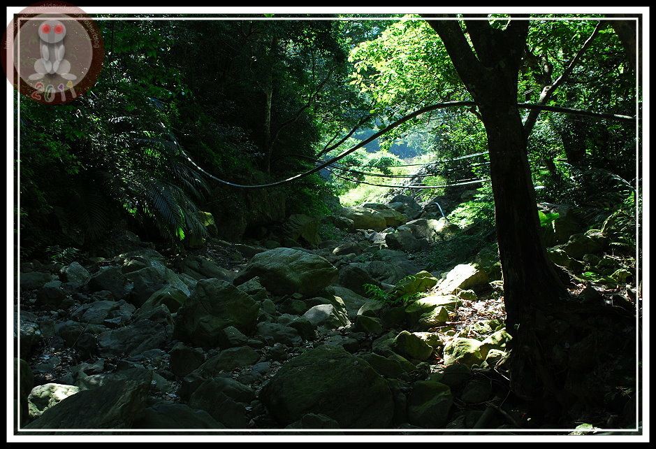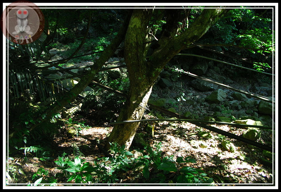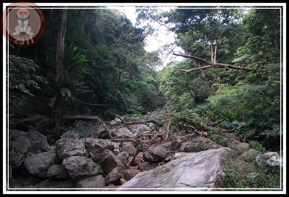 走到最後,在山溝旁出現了1.2K的指示牌,從這裡距離三角點2.6K,循著指標看去...階梯一路上溯,應該河床尋路就此結束了吧。回頭看看,剛剛應該走乾河床,雖然大石頭要爬上爬下通過,但總好過山溝邊的密林吧!如果我的直覺沒錯,這種地方正是「生態豐富」,一個不留神可要與凶神惡煞撞個滿懷。