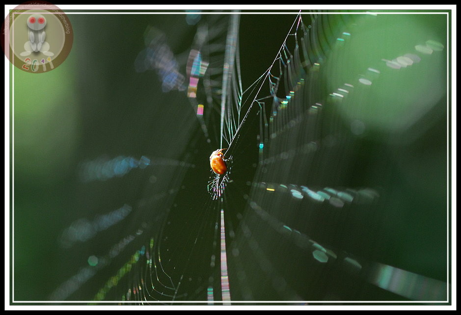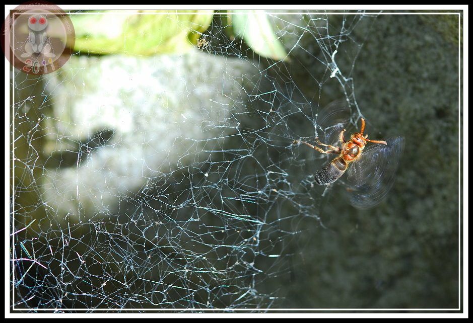 黑尾虎頭蜂生命力強韌,剛到河床就發現有隻虎頭蜂陷在縷網蛛的網子裡,蜘蛛已經由洞穴接近而虎視眈眈。當我拿相機靠近,身影一晃,讓光影變化,縷網蛛立刻躲回洞穴、放棄到手的佳餚。而這隻虎頭蜂竟趁隙揮振翅膀直到脫困,然後似無其事地在周圍又開始巡邏起來。