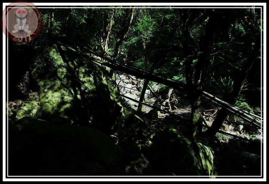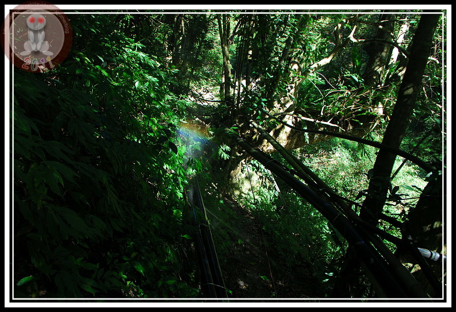 下切河谷再上溯是我最擔心的轉折點,網友一再於文章中叮嚀要注意上切點,避免迷路。我卻發現沿著溪谷的水管上被山友一路綁上登山布條,除非刻意忽略,否則要迷路還真不簡單。順著布條指引,原來路就沿著河床前伸,偶是水管路、偶是階梯、偶又是需要四肢並用的岩塊攀爬。沿著溪前進,途中還遇見粗壯的水管破裂,強烈水柱攔住去路,顧不得水柱被陽光映出彩虹,順手將相機包入懷中,背對著水柱硬闖,瞬時大腿、臀部傳來一陣沁涼...若是在酷暑,這應該是山客的絕佳福利。