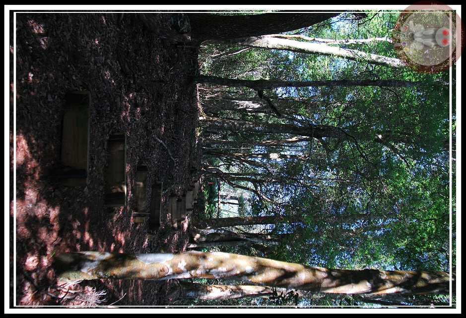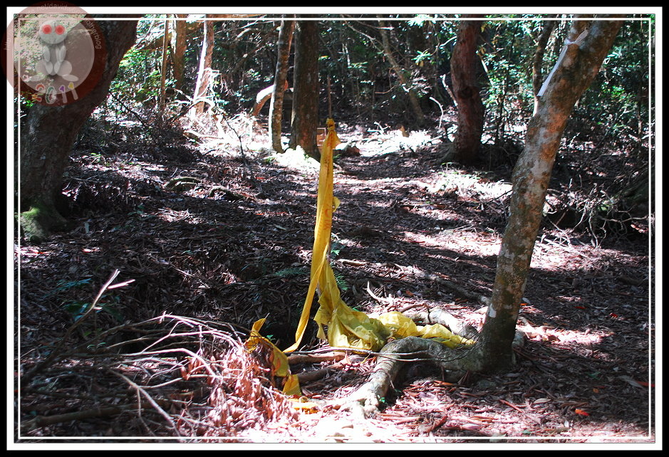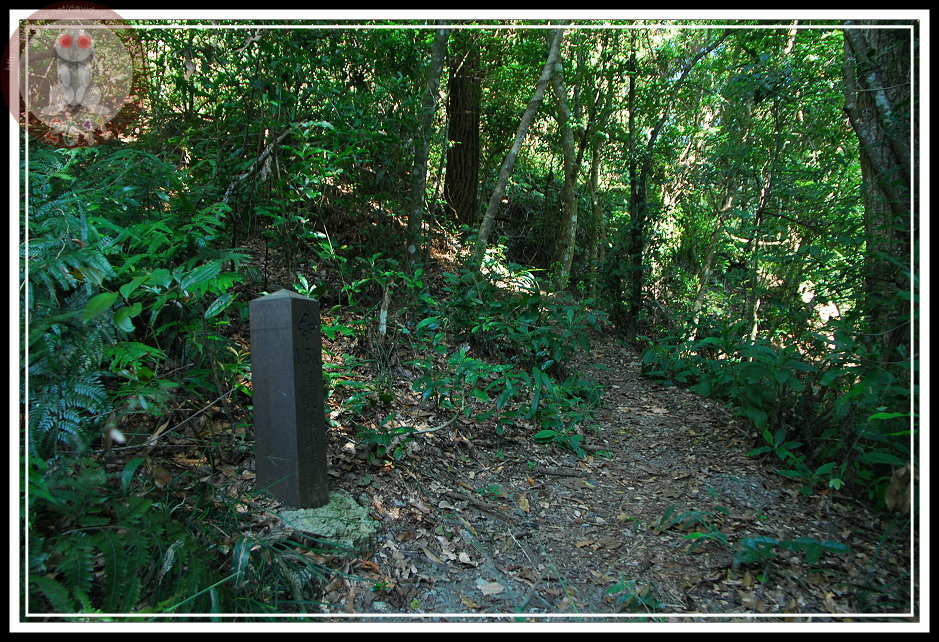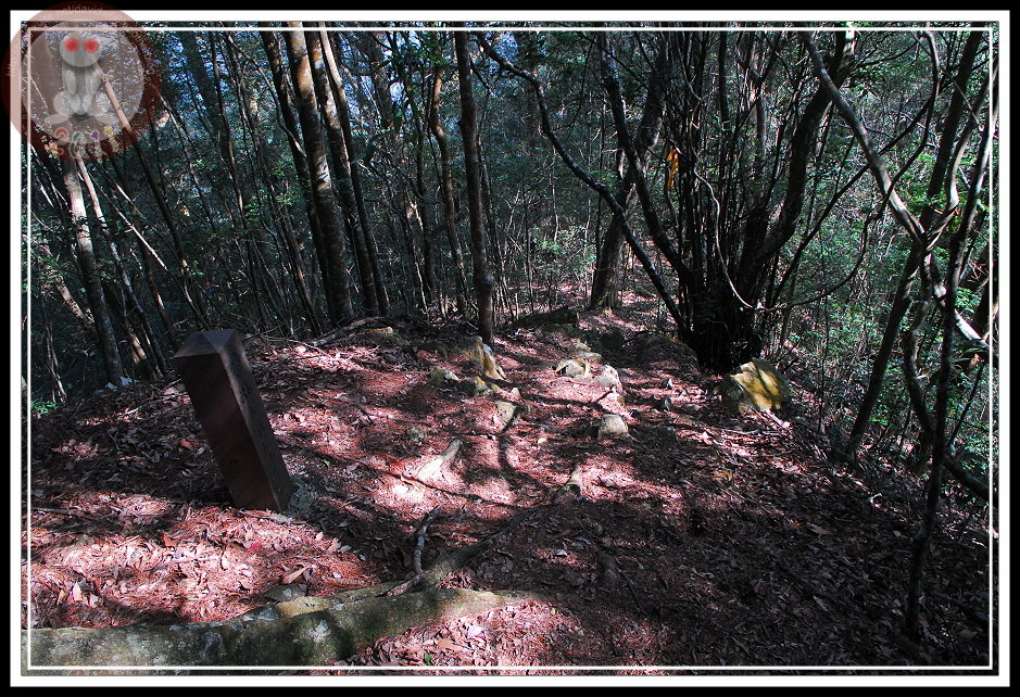 穿過墓園,迅即進入芒草叢中,只是芒草早被踩出好幾圈四通八達的小徑,圈繞的小徑中間有包圍著兩、三做用藤、樹枝紮成的茅草涼亭。那構造物有些早就傾圮,我站著觀察一陣子,高舉手臂、低頭護住臉闖進去,果然芒草叢的另一端出現樹林,出現登山口的里程碑,也出現一條寬闊的產業道路。原來..我走錯路了...後來下山之後開車回頭走,原來往回走二、三十公尺另外有一條「屋我尾山的登山口」小路,可以驅車直上登山口。因為位於十文巷彎道內側,標示位置不理想,極容易錯過。再仔細一回想,「防火標示」底下的登山口標示並不往墓園指,而是往山下去,只是我登山的時候只急著要「朝聖」,沒弄清楚而走錯了。