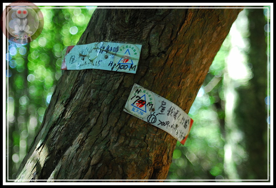 我也發現這擺在樹頭上的盆子,不知道是什麼實驗,應該跟樹冠層的生態有關吧!這樹被實驗,身上也可憐地被釘上粗壯的鐵釘,供研究人員爬上樹去執行工作。除了這一個,下山的時候也在一處山坡遠遠地看見一模一樣的盆子掉在落葉堆裡,想走過去看...又怕那是台灣黑熊就地取材獵捕午餐的行當...,遠遠地用鏡頭交代一下,絲毫不敢偏離山徑。