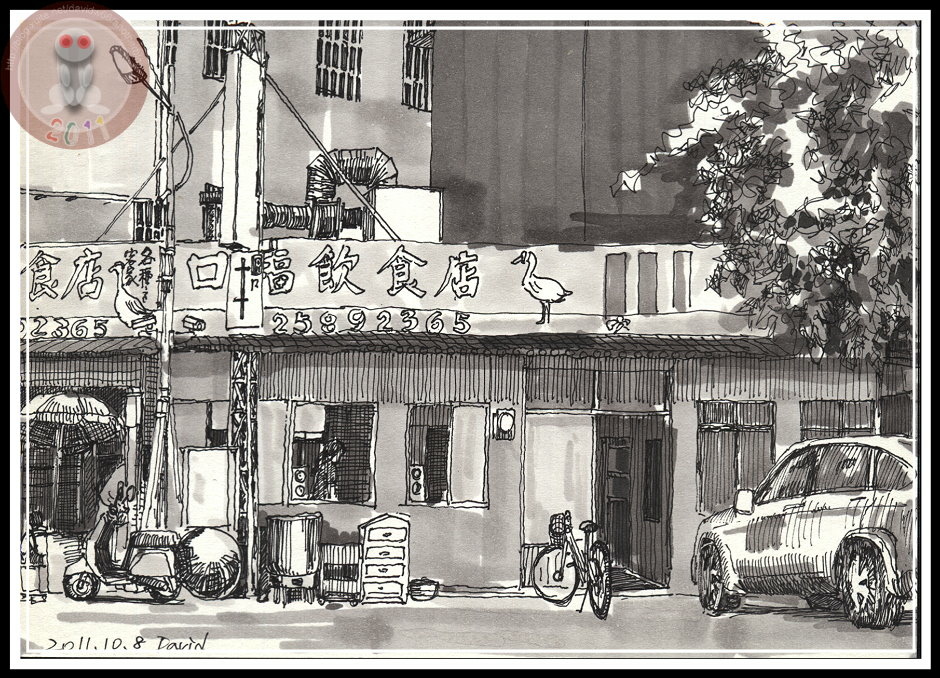 今天沒進店裡點盤鵝肉解解饞,只因為兩個人點不了一桌菜,沒變化的菜色徒留遺憾而已。於是兩父子就坐在對街的車上聽音樂、畫圖,古人有「畫餅充飢」,那小犬與我算不算「畫鵝解饞」?畫了店門口大景,忽然覺得自己怎麼像替鵝肉店畫看板一樣?是不是應該向店門口招呼客人的老闆討賞去。講鵝,不知道有沒有記錯?王羲之好鵝,拿寫出來的字換鵝去;而我,可不可以拿這張明信片「換鵝」?心裡這麼想卻不敢輕易嘗試,老闆的記憶力強,幾次光顧之後就把我當熟客,如果「換鵝」不成反被當成「瘋子」,那下次鵝癮犯了想打牙祭卻被列為拒絕往來戶可就得不償失。
