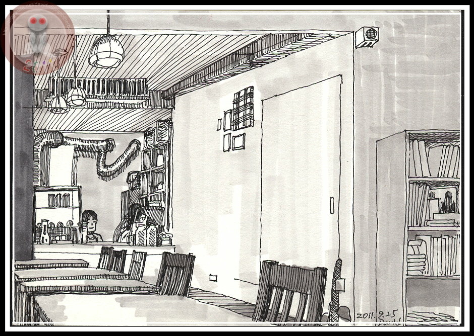 這家咖啡館新開沒多久,離誠品更近。兩個年輕的女孩坐在櫃檯後面等待客人,主動但嫌生澀的互動,我想她們應該是充滿熱血、自己當老闆娘的勇敢創業族。進門已經晚了,三三兩兩的客人,我才擺好陣式,隔壁的小女生立刻離開,大概是想「這怪叔叔怎不住地瞅著人家?」只是我沒有非分之想,也沒再拋媚眼,誰叫她比我靠近深處的櫃台,我要畫...當然也得不住地轉頭觀察。走了之後,店裡真是剩下我們...有點清冷,也許跟她最低消費100元,電腦插個電立刻跳升180元有關吧。年輕人開店大不易,尤其在強敵環伺的黃金地段。但沒人告訴她們放長線、釣大魚...讓小利的生意竅門嗎?
