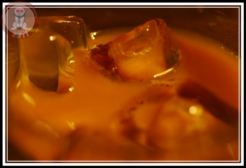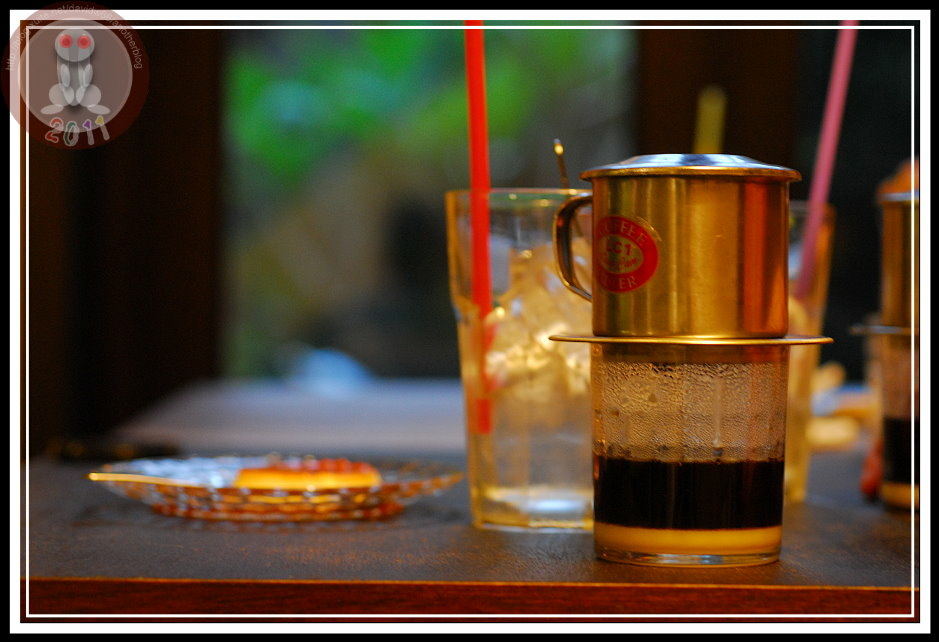 當小妹端著稍稍摻一點透明液體與滿滿冰塊的玻璃杯上桌,我嚇了一跳...莫非,這就是莫測高深的「越南咖啡」?端詳了一陣子,小妹才又端來咖啡壺,原來越南咖啡用不鏽鋼小壺沖泡:她們將咖啡粉放進鋼杯,壓上圓形隔板,再衝入熱水,咖啡就由下方滴入底下的玻璃杯,類似簡易版的美式咖啡壺原理。壺底已經是先放進越南煉乳,等咖啡滴漏完全,輕輕地攪拌均勻,最後倒進最先上桌的冰塊玻璃杯裡,一杯越南咖啡焉然成形。泡咖啡的方式非常有趣,與我熟知的摩卡壺、曬風壺大異其趣。喝起來,卻因為煉乳加了不少,味道與「貝納頌」極為相似。