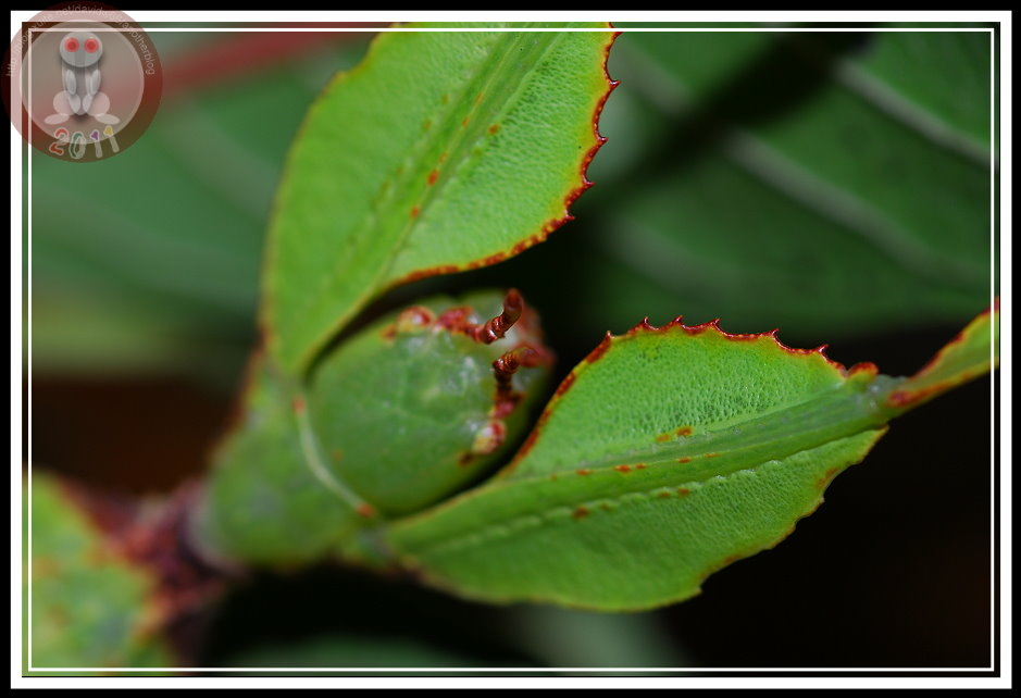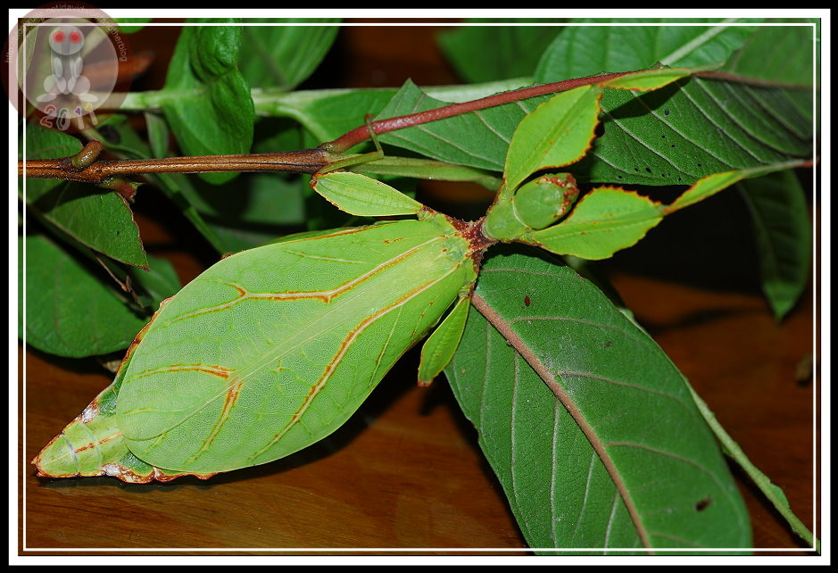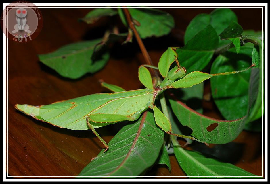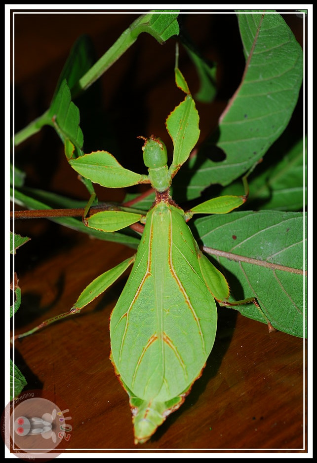 前陣子,拿到兩隻葉脩,一種來自熱帶亞洲、長得像葉子的竹節蟲,且喜愛豢養竹節蟲最最基礎、普遍的芭樂葉。拿雞精的玻璃罐子插兩支芭樂葉就可以供應牠們一星期所需,偶爾噴噴水保持環境潮濕。我原以為葉脩都像幼蟲一樣「薄薄的一片」,星期一較大的葉脩一脫皮忽然長成大個子,而且「葉子」中間軀幹變得又肥又厚,仔細一瞧...牠長出翅膀,翅膀是判斷許多竹節蟲成熟的重要依據。這是一隻雌葉脩,身體較寬。