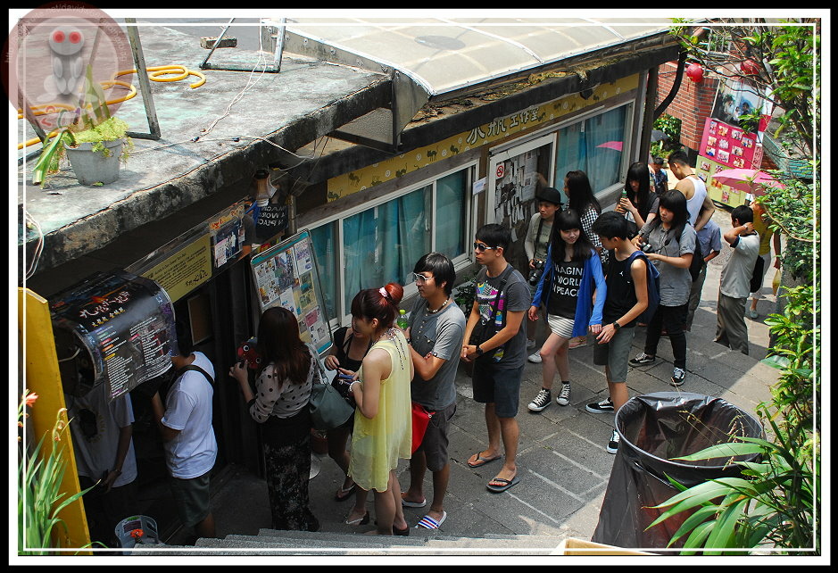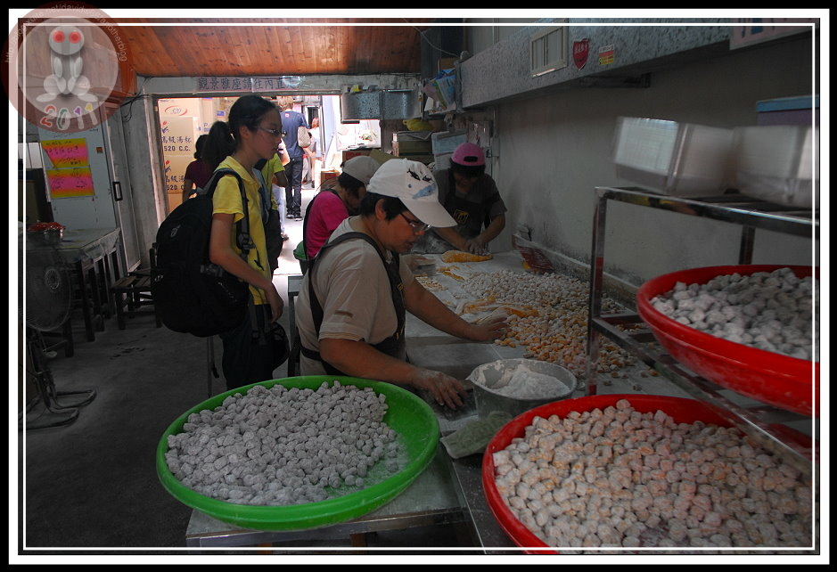 當然,九份的特色絕不只有芋圓,只是老街到處都是賣芋圓的店,有小店面光賣芋圓的;也有大陣仗一票人坐在店裡現場製作;甚至走到豎崎路頂九份國小門口還遇見大排長龍的「阿柑姨芋圓」。