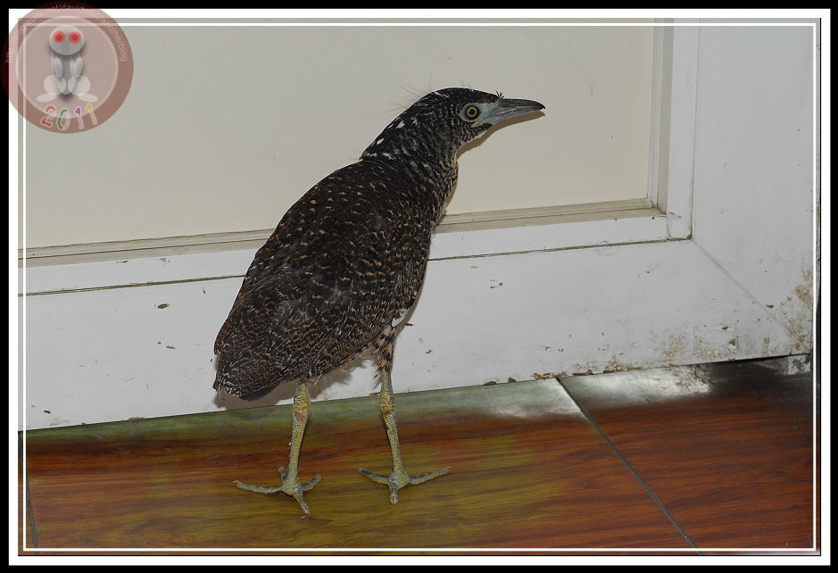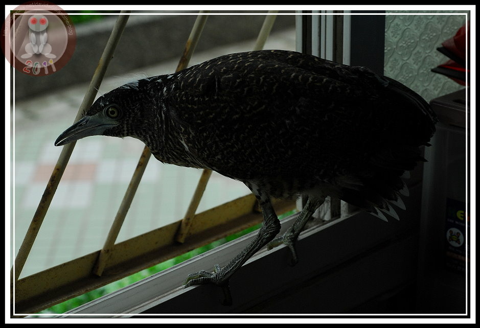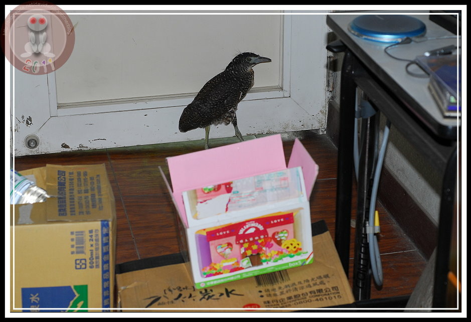 警衛先生一放手,小黑冠麻鷺就往辦公室幽暗處跑去,他拍拍手、一派輕鬆地微笑離去;我則開始傷腦筋...該怎麼讓他安渡這個下午,而且千萬別在裡面「嗯嗯」啊!