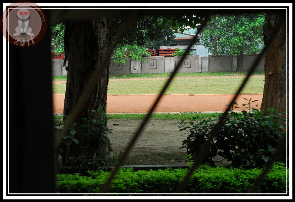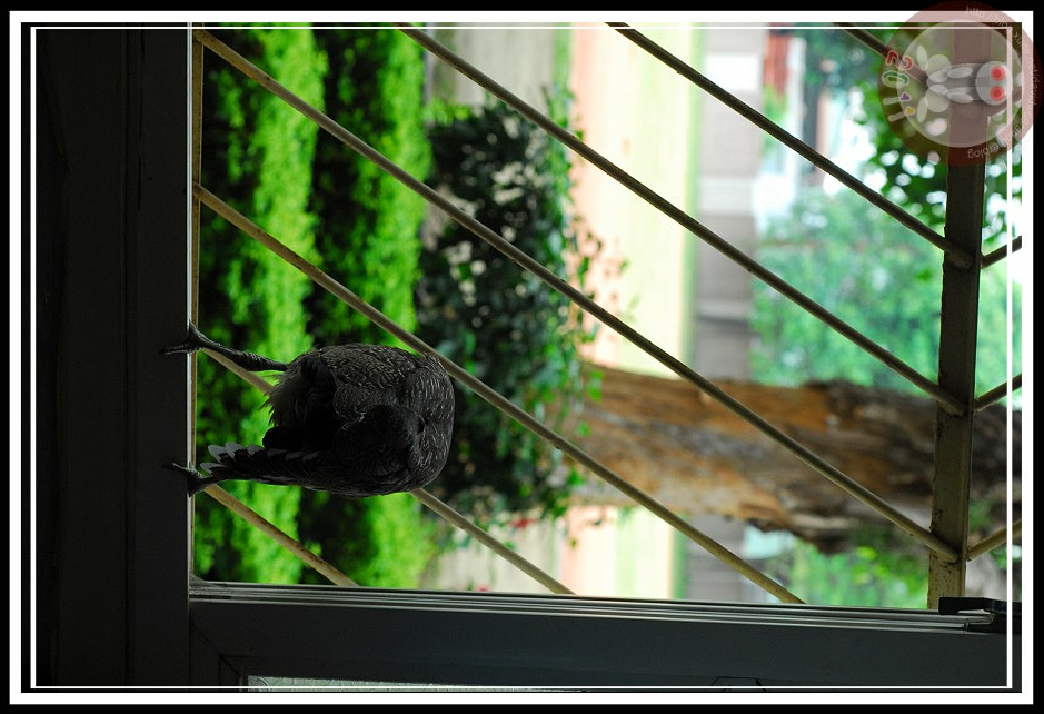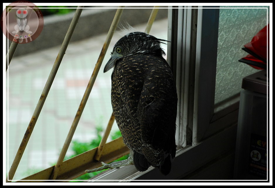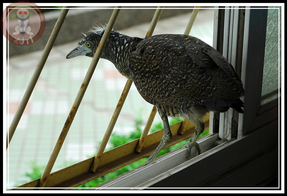 為了避免牠驚恐而誤傷自己,就任由牠在紙箱後面活動不再觀看。過一會兒再去查看,「鳥不見了」,一群人開始探頭往地上、桌底找...「牠在那裡!」同事手指頭一指,黑冠麻鷺竟然神奇的從角落飛到窗戶旁邊,先撲倒在舊制服堆上,半張著翅膀,哀怨地看著窗外與逐漸靠近的我們。再一躍,他縱上窗台,想往外飛卻被鐵窗攔下來。我站到牠身邊,牠彷彿知道我不會出手抓牠,沉穩地站著,然後想往窗玻璃與鐵窗之間的空隙鑽進去,可惜翅膀被卡住了。又後退回窗台之際,牠忽然發現鐵窗的縫隙夠寬,可以將頭伸出去,牠停下動作。此時,我終於明白,牠應該就是會飛、被迫離巢的雛鳥,只是不知道為什麼在小孩與警衛伯伯的圍繞下,不小心被抓住而已。就再按下最後一次快門聲響,牠敏捷地鑽過鐵窗,用與牠的爸爸、媽媽在操場上與我相遇時候相同的飛行動作,平平地張開翅膀、優雅的飛過操場,直到百公尺開外的黑板木上去了。
