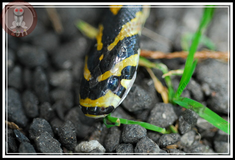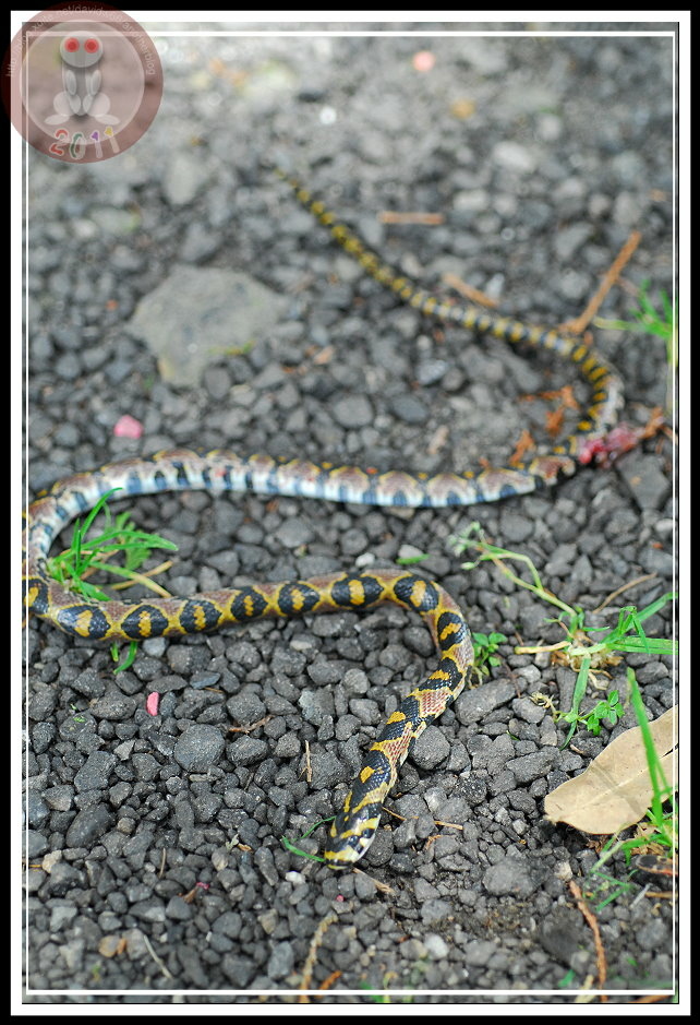 常買魚的人都知道,看見混濁的眼神就知道漁獲不新鮮,因此這蛇頭的眼神也透露出「牠是條死蛇」的秘密。在大雪山保安宮前的柏油路上橫屍,接近尾部有處破綻,應該才被車子輾過。在旅遊經驗中,只要遇見蛇,那地方就保證好玩,可惜今天遇見的是死蛇,若是活的,那圍著驚慌失措的高砂蛇鐵定又是難忘的旅遊經驗。