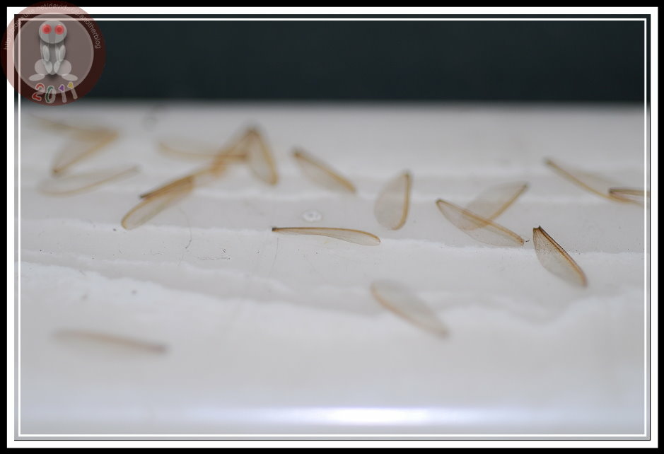昨天,我們忘記關閉頂樓晒衣場的日光燈,當我沿著樓梯「蒐集」白蟻到達時,鐵門下面已經鋪滿白蟻脫落的透明翅膀,不計其數地由門縫下鑽進來。滿滿的裝滿一盒,最後終於受不了,打開水龍頭...白蟻愛濕卻怕水,尤其那大大的翅膀被水黏住,白蟻也只好六腳朝天拼命掙扎而已。我曾見過壁虎就沿著積水邊緣,一路狂吃白蟻。