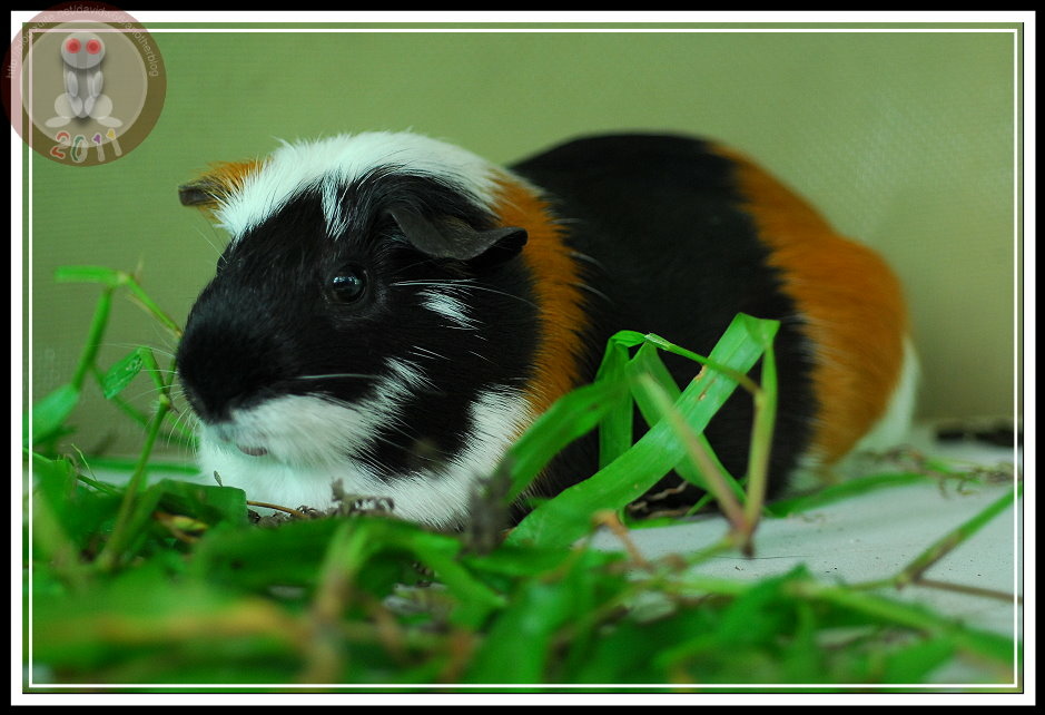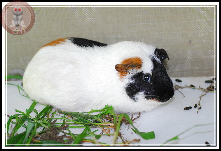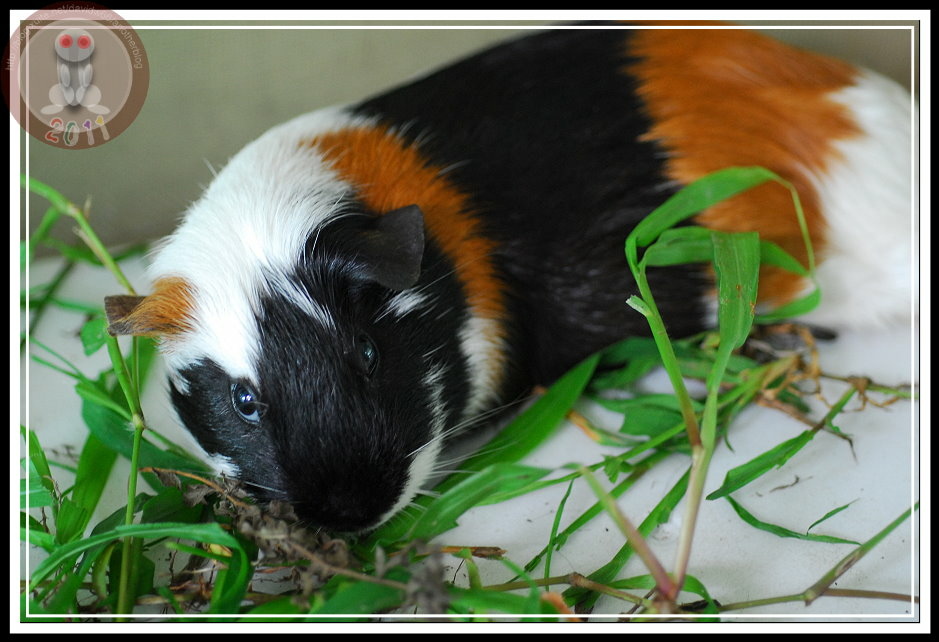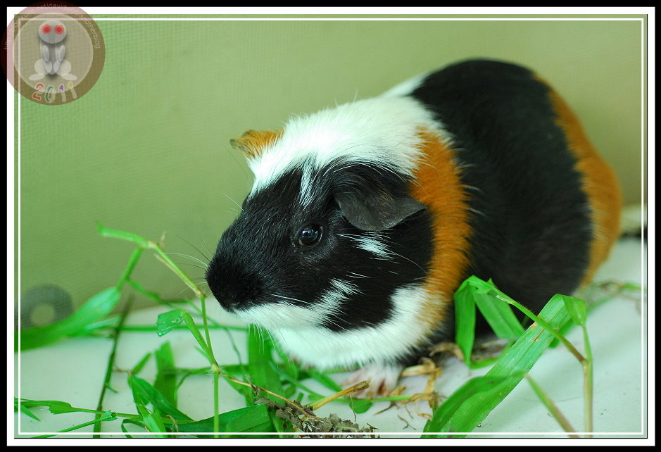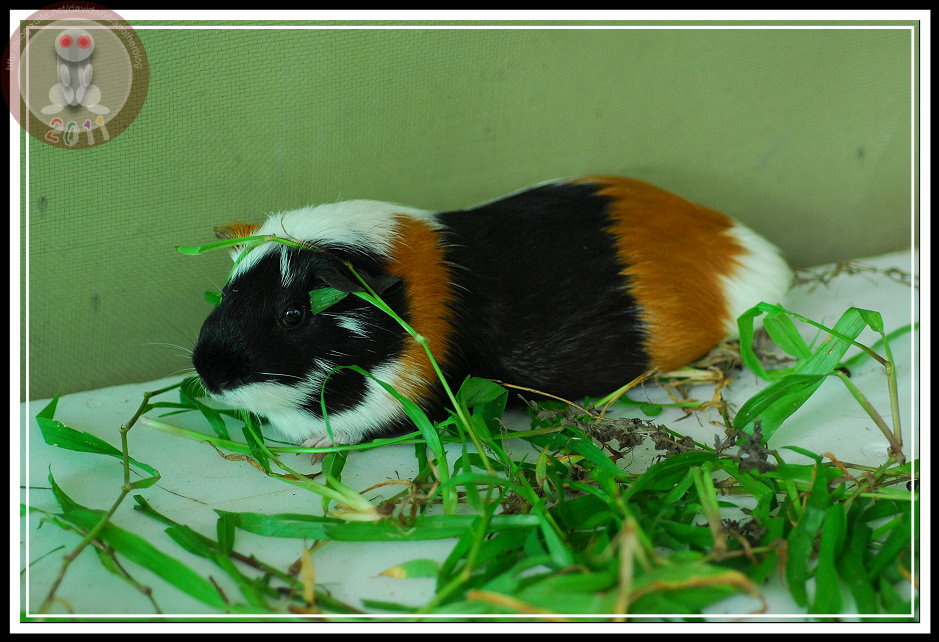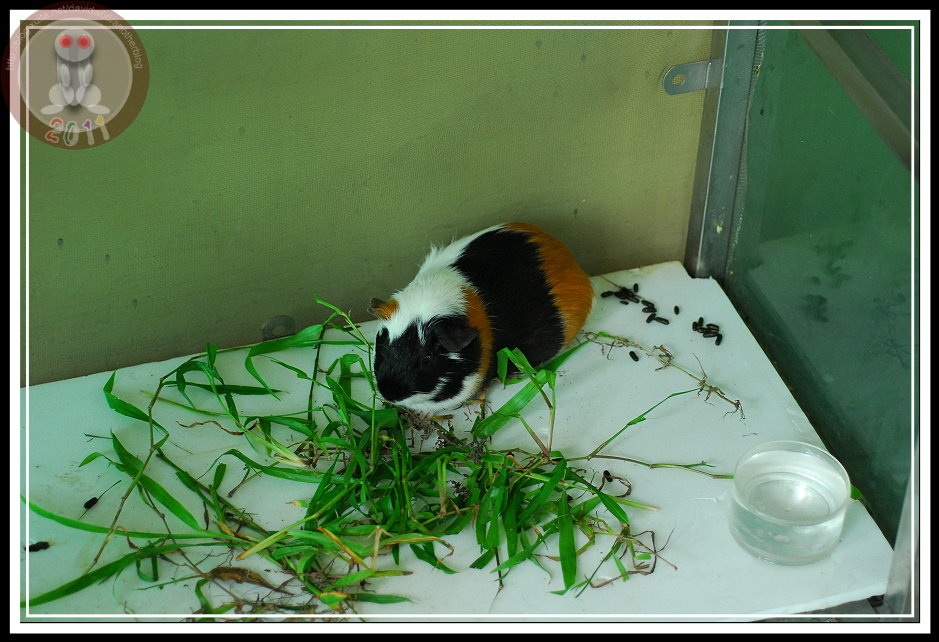 昨天早上,在操場掃地的小朋友又跑來說「操場上有老鼠」。直覺認為是野鼠被人毒殺,天亮後沒有體力躲回巢穴。結果...遠遠就看見花斑...怎麼又出現天竺鼠?天竺鼠不怕人,貪心地啃食野草,只有發現我下定決心要將牠捉進水桶才勉強逃竄幾步。手到擒來的天竺鼠被關在僅容迴身的水桶,卻不攀、不爬、不逃竄。直到辦公室的鐵窗外趴滿聞訊而來的孩子,我這才想...都是天竺鼠,害得我們成了獸欄裡的動物了。趕緊推來蝴蝶的展示箱,罰肆意亂闖的天竺鼠在走廊上「罰站」...直到下午,怎麼籠子裡、籠子外、整個走廊都是雜草...,看來,多放幾天,工友先生就可以省去割草的氣力了。