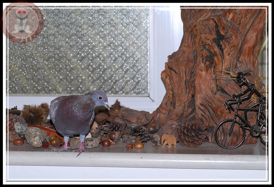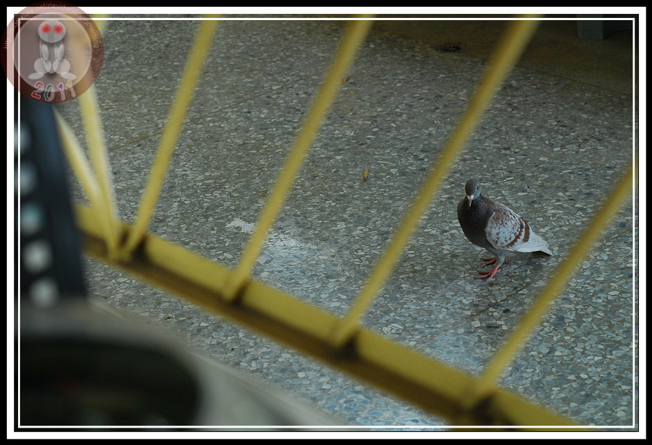 皮鴿顯然已經將辦公室當鳥巢了,沒事就在裡面晃來晃去。當我受不了,把牠趕出去,皮鴿站在門外走廊或洗手台上,只要有人打開門,牠立刻跳到地面搖搖擺擺地想要走進來,與我比賽「誰堅持得久」。如果,我門都把門禁維護得很好,皮鴿就會又嘗試著想穿過欄杆,施展輕功「飄」進來。原先的鐵欄杆向左斜,我把窗戶關起來,蹲久了牠也會開始嘗試著找向右斜的欄杆,即使欄杆的窗台堆滿雜物,牠還是千方百計地嘗試。在辦公室裡面,就看著一隻粉鳥「ㄆㄧㄚ!ㄆㄧㄚ!」地不斷撞著欄杆...不是為了投奔自由,是為了進到屋子裡,當然「有志者事竟成」,練習久了,欄杆、雜物紙是寥備一格而已。