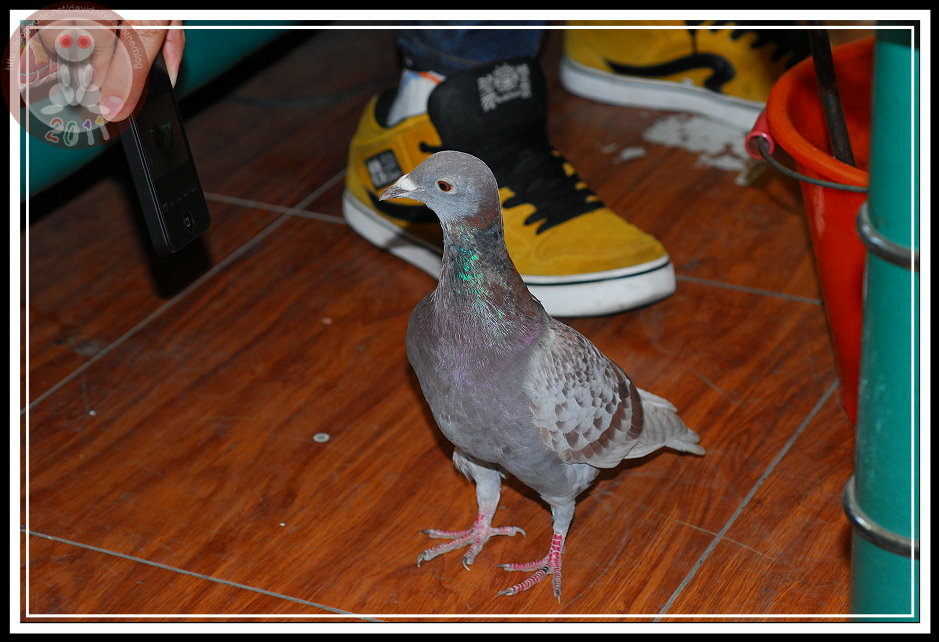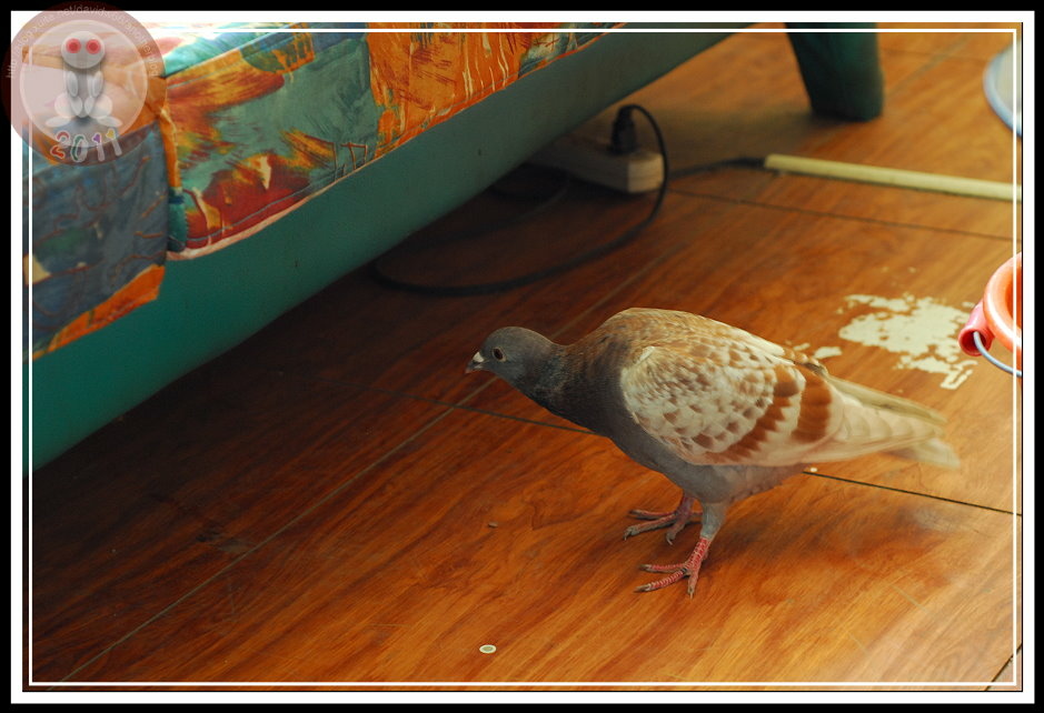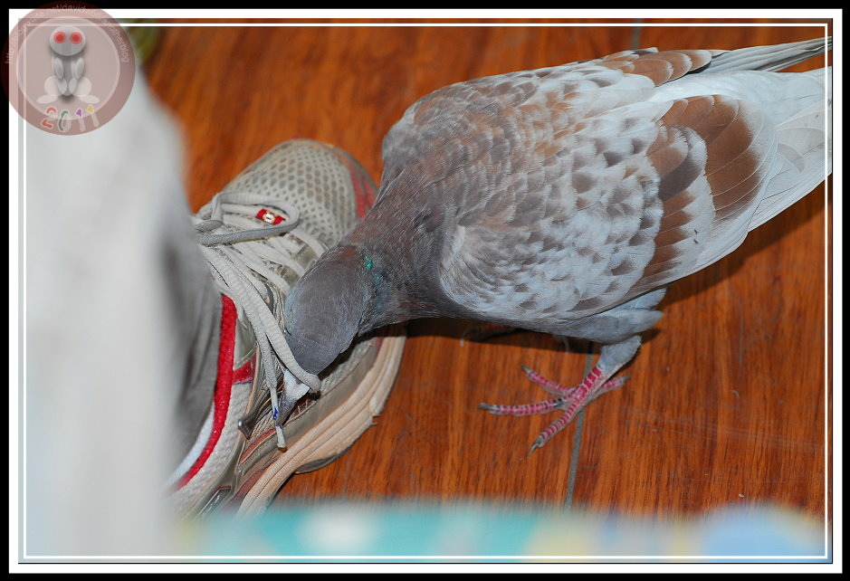 進來之後,趁著出出入入的同事不注意,啄一下露出涼鞋的腳指頭;翹個二郎腿也要小心,皮鴿會出其不意站到腳掌上,叼一下鞋帶,更過分的將頭穿過鞋帶的繩圈打起結來。我真想跟牠說:「皮鴿啊!皮鴿!再玩下去...有天就會被人家抓去「烤乳鴿」啊!」