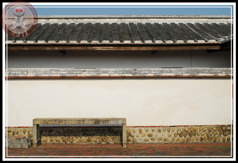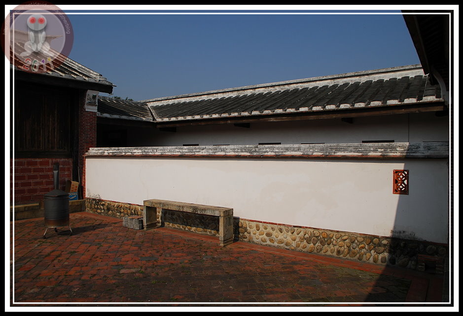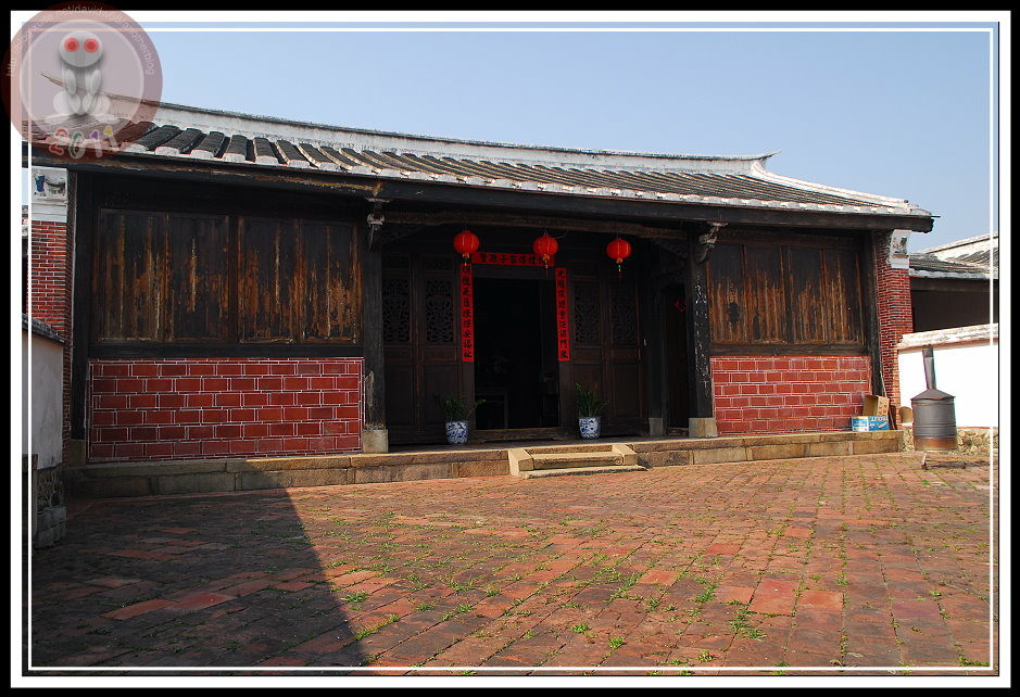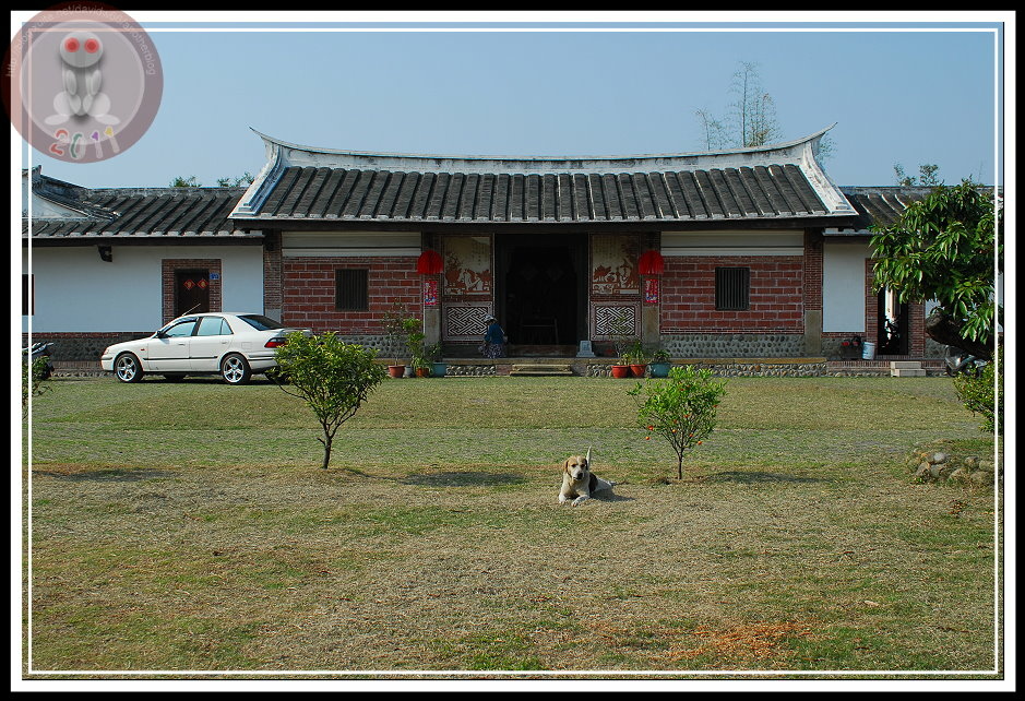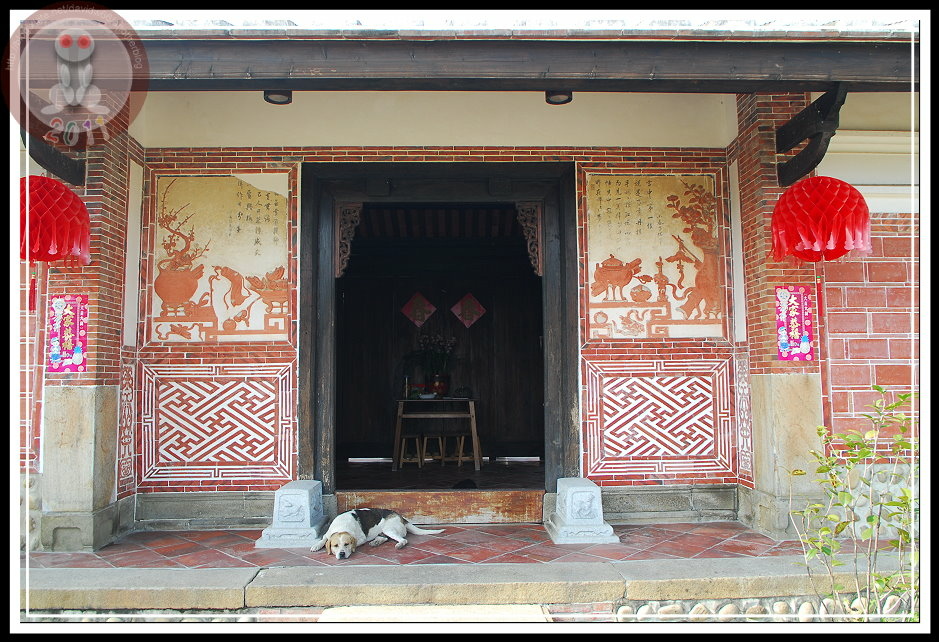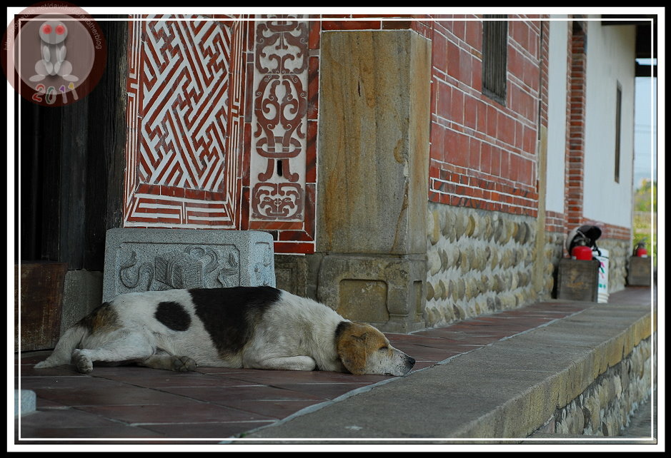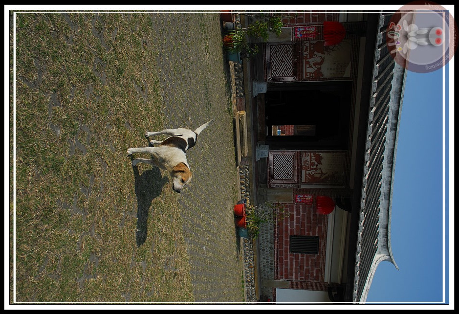 來頂瓦厝參觀,必須先習慣守著老宅的老狗,一踏進廣場,狗兒們由四面八方邊吠邊圍攏過來。要不是有腳踏車可以為阻隔;要不是主人出聲喝止,我肯定在阡陌之間上演人狗追逐的戲碼。這狗盡忠職守,當我進入廣場,先來貼身狂吠;主人喝止後,我得以自由在廣場參觀;一想往屋子裡走,趴在大門的狗群又群起狂吠,又需要主人第二度喝止才得以入內。有趣的是,當我由屋內走出來,這狗慵懶地趴在地板上,懶都懶得理我,看來我身上已經有他熟悉地味道了。