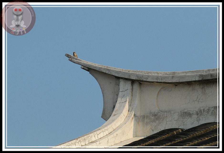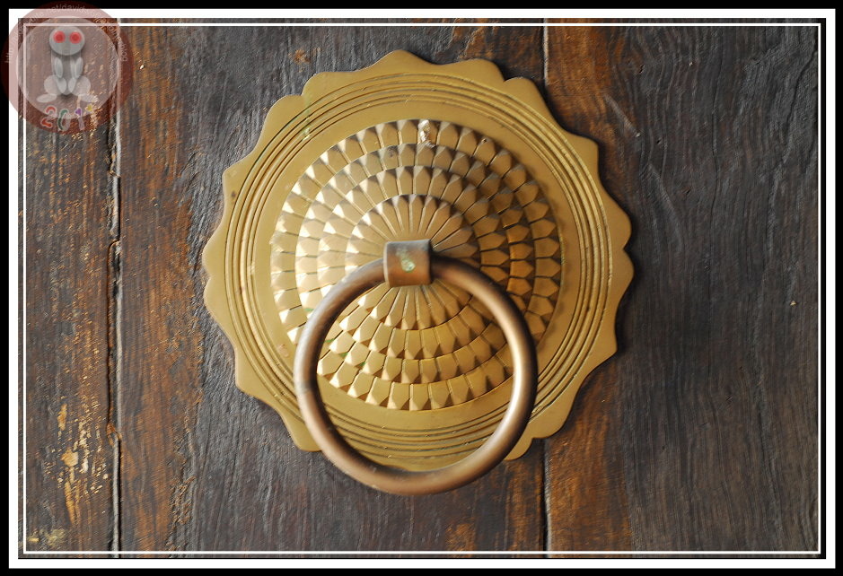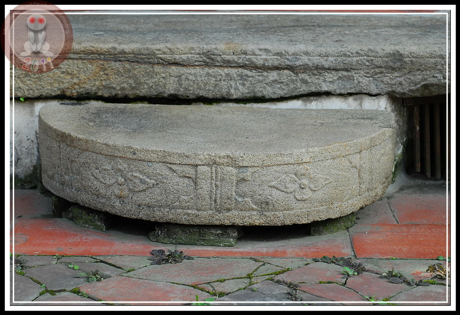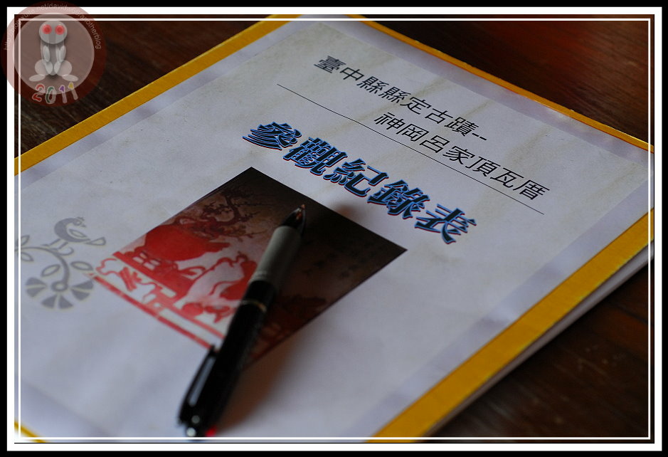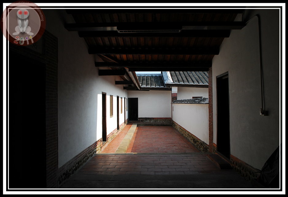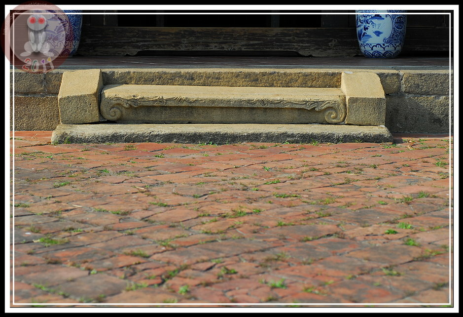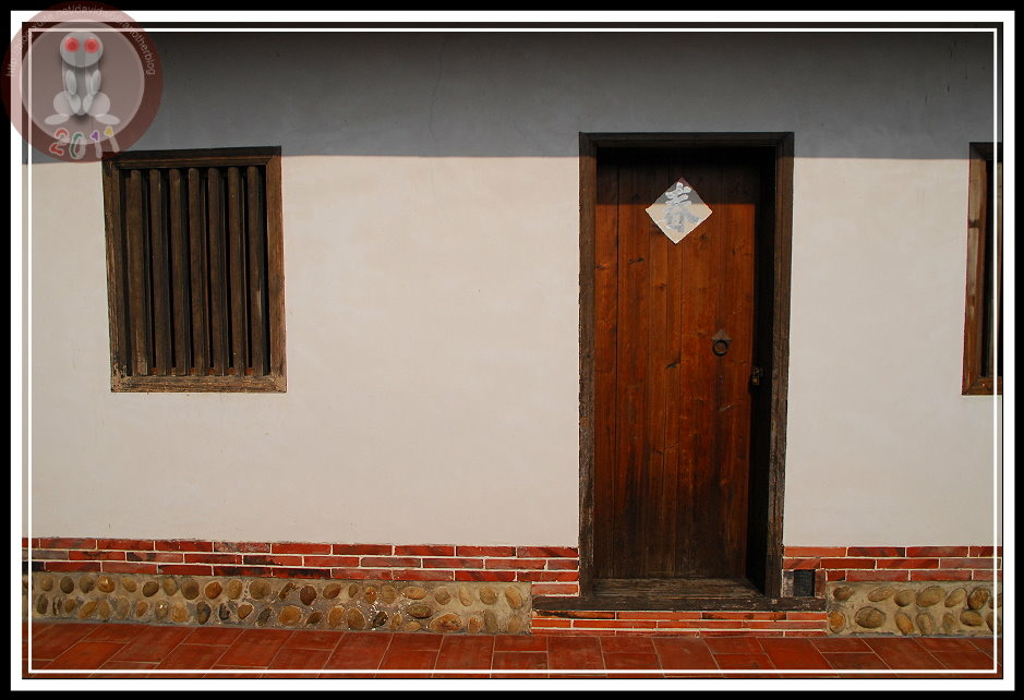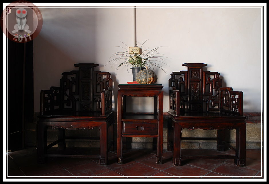 來頂瓦厝參觀,必須先習慣守著老宅的老狗,一踏進廣場,狗兒們由四面八方邊吠邊圍攏過來。要不是有腳踏車可以為阻隔;要不是主人出聲喝止,我肯定在阡陌之間上演人狗追逐的戲碼。這狗盡忠職守,當我進入廣場,先來貼身狂吠;主人喝止後,我得以自由在廣場參觀;一想往屋子裡走,趴在大門的狗群又群起狂吠,又需要主人第二度喝止才得以入內。有趣的是,當我由屋內走出來,這狗慵懶地趴在地板上,懶都懶得理我,看來我身上已經有他熟悉地味道了。