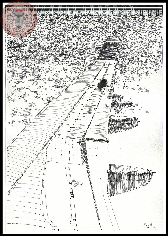 在地面看著龐然大物,很讚歎人類的聰明才智與科技,也以為可以信賴。到了高空,地板咚咚作響搖晃,翼尖像薄紙片的抖動,才清楚其實飛機並不如想像中的堅固,所以飛行員在一般人心目中擁有「英勇」印象的原因。機翼很容易可以描繪完,費神的其實是天空與雲層,用代針筆畫完機翼,我想應該祭出0.1針筆本尊,才足以表現天空與雲的距離感。一轉開筆蓋,「趴塌!」一沱墨汁立刻滴花了機翼...我也立刻懊悔自己的粗心。平常在地面用慣了針筆,竟沒有想到上高空後壓力降低,墨水全被擠出墨水管。古代畫家妙筆生花,遇到滴墨,自然加翅膀、加花瓣化成蟲鳥、美花。可是機翼上該如何補救?總不能畫個蒼蠅吧?而且我又不是搭乘軍機,來個「青天白日滿地紅」。最後也就任由墨漬乾涸...就當作旅程的印記...告訴自己,下次要注意。