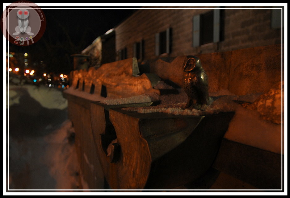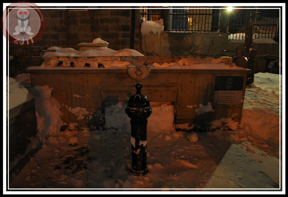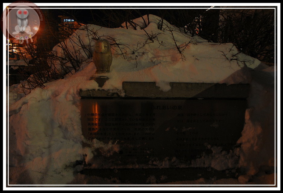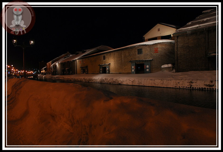 越離開人群,感覺上越貼近小樽運河當年的感覺,左邊積雪被雕出塑像,可惜沒有燈,只能藉助反射過來的光線摸索而已。雪後面,是高過人的坡坎,聽聲音知道是大馬路,看不見也好,至少能想像當年雲集,而那聲音就把它當作車夫吆喝。