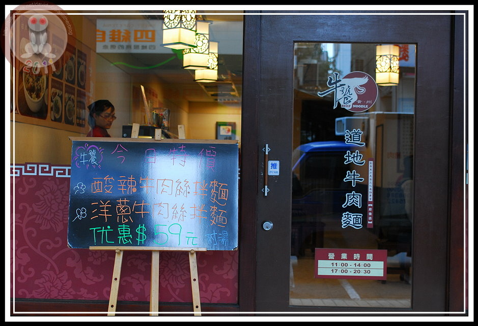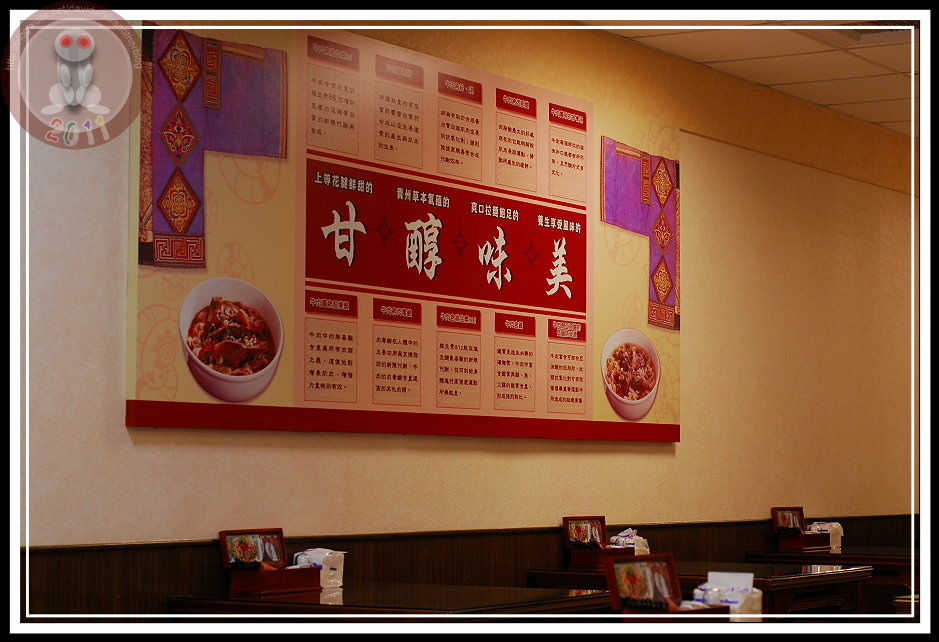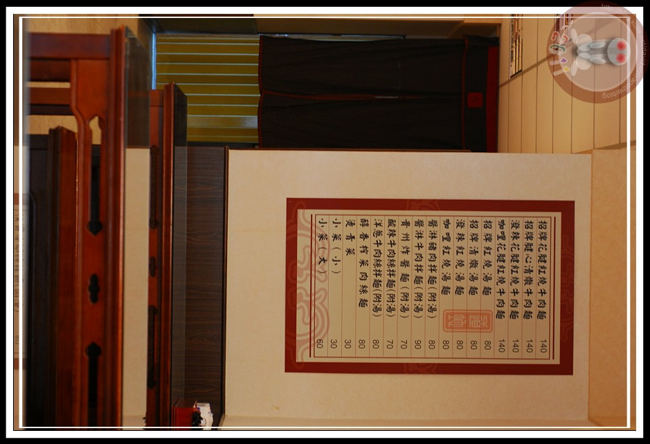 兜了半圈,好不容易擠到一位停車,就挑街對面的牛饕道地牛肉麵...反正一碗牛肉麵。時間尚早,一般上班族應該還在辦公室裡計畫午餐,店裡就只有先我們進來的一桌客人。小姐遞上菜餐還倒杯熱茶...慘了!服務太周到...肯定...#%$。果然,菜單最上方的頂級牛肉麵一碗要價 210 元,也許住北部的格友們吃慣「牛肉麵節」的高檔麵食,早也習慣那「高檔價錢」。中部鄉下地方,一碗麵90元就算「高級」了。既然進來了就嚐嚐鮮,點...下面一點的「招牌花腱紅燒牛肉麵」,我指定「紅燒」,因為在豐原光顧過ㄧ家「清燉牛肉麵」,可能是我味蕾駑鈍,印象中那碗麵就只有麵粉味兒。然後,又點了魯雞腳與海帶芽。