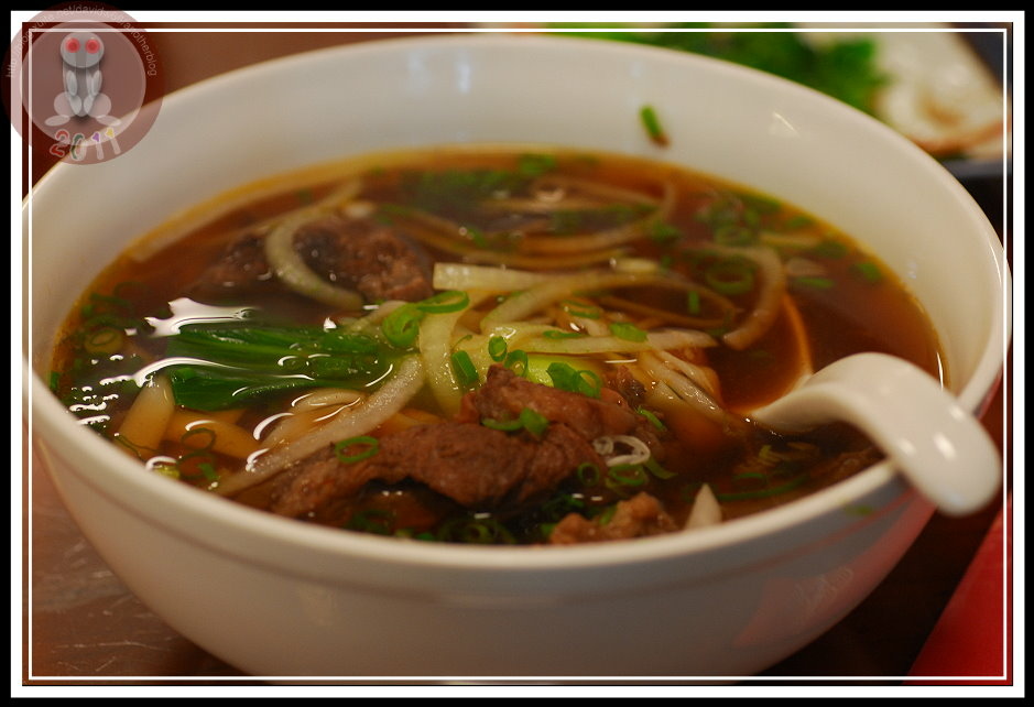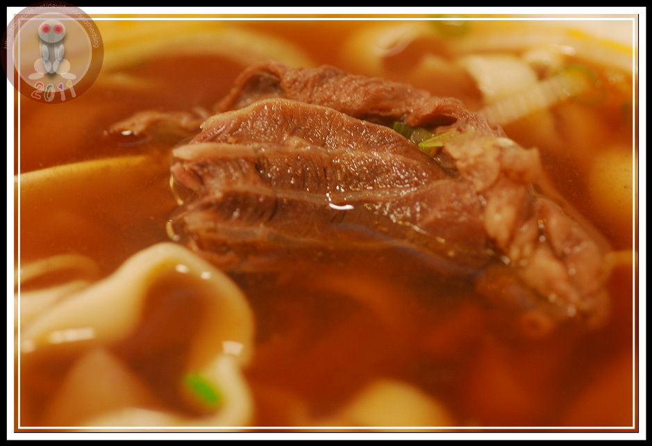 不一會兒,小姐由窗口端來白碗裝的麵...看來與公益路勤美誠品旁,小偉讚不絕口的牛肉麵有點像,大塊牛肉魯得夠久、夠軟...只是牛饕的牛肉帶筋油花層層分明,似乎又多幾分美感。湯頭恰到好處,香甜又沒有過多的香料藥材味兒。唯一美中不足...我吃到一半才聽到小姐位鄰桌先生解釋菜單提到,麵也分寬麵、細麵...。可,剛剛她卻沒告訴我,來了一碗寬麵。