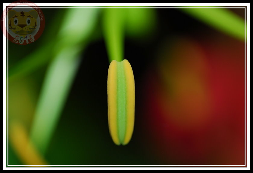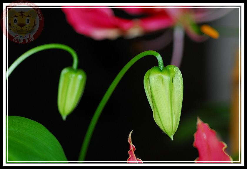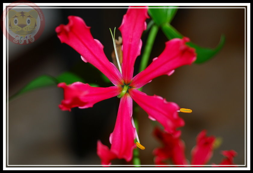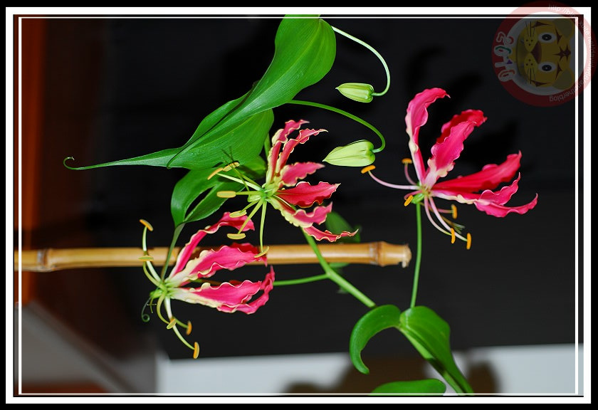 這是夏天的照片,據說火焰百合在炎夏兩端的季節會分別開花。花市似乎很少可以見到他的蹤影,不知道是不是因為生性野放。後翻的花瓣與誇張的雄蕊,讓這花不管是造形、顏色都相當突出。葉子尖端演化捲鬚,可以隨意攀附上周邊的植物,當然自己也就不必耗費能量發展出堅強的莖幹。我拿廢棄的掃把,隨意插在花盆中間讓他攀附,短短時間,火焰百合就無法滿足地爬上仙人掌、土肉桂了。