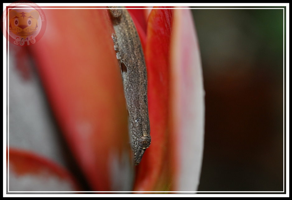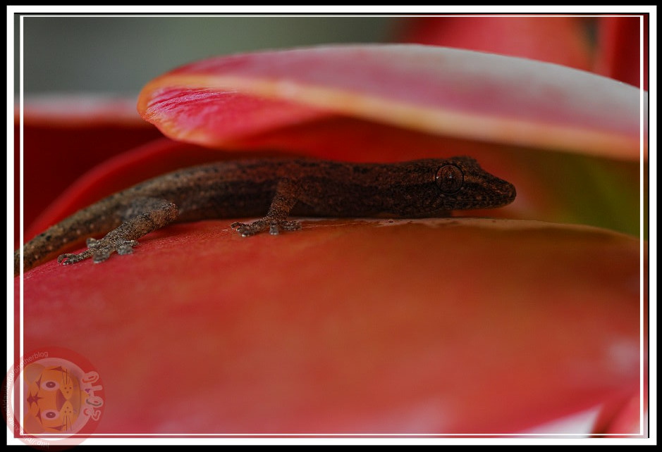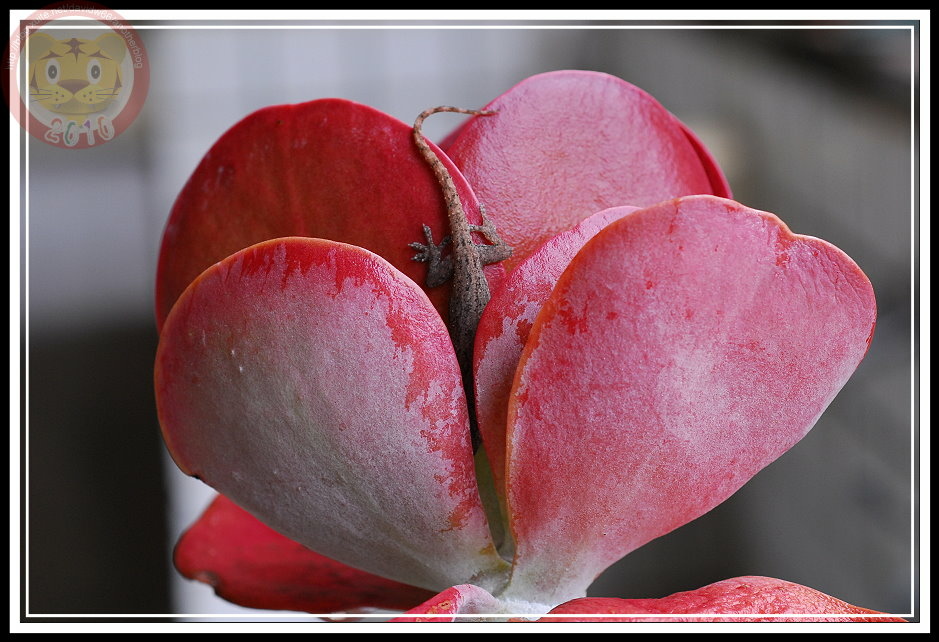 沒想到,與眾多帶刺仙人掌為伍的唐印隨著越來越冷的氣溫變紅,直到前幾天寒流真正來襲,中部氣溫下探到八度,唐印算紅到極點。那天,卻也在唐印的葉片之間發現一隻疣尾蜥虎,頭朝裡面,尾部捲曲著。疣尾蜥虎就是一般家裡常見的壁虎,房子裡的粉白色,野外的則成黑褐色、有花紋。只是,大冷天的白晝趴在植物頁面上,不太像壁虎該有的行徑,他不是應該找個陰暗的縫隙躲起來嗎?他的動作有趣,所以拿相機拍他,心想「他該不會被冷死吧?」還是他誤以為唐印火紅的葉子能夠發熱,所以緊抱著取暖?天氣冷,他的反應也遲鈍,我將花盆翻來轉去,甚至掰開葉子瞄他藏起來的頭,他都沒像晚間那樣機警地逃竄。