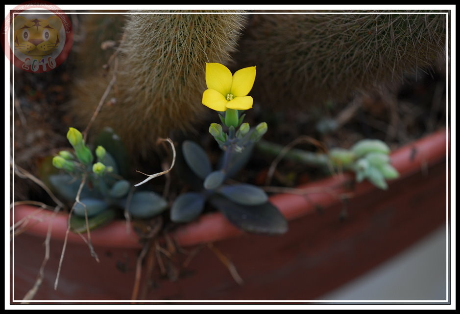 誰能告訴我這是什麼?好像在花市也很少見到這植物,他很容易繁殖,只要一小株丟在沙土上就能繁衍出一整盆。花開之後,第二季也會密密麻麻地出現。記得他是從市公所裡的花盆偷偷摘幾片葉子回來,就每年準時在這個季節開花,當時四下無人,也問不到這究竟是什麼植物?或許,也因為太容易繁殖,所以市場上也不太有商家願意青睞。他的花有點像長壽花之類...一整年慢慢成長,就在冬天的陽光下開出一整片黃花。這幾棵落單了,應該是換土的時候偷渡過來,但顯然她們可以跟仙人掌一樣耐住長時間的乾旱與豔陽,一整盆的還含苞待放,她們已經拔得頭籌。