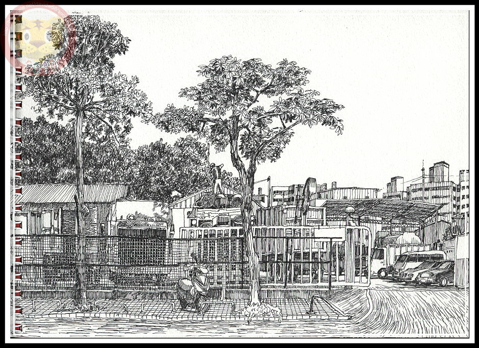 這幅「清潔隊」,我來坐在對面四次,因為天氣熱,每次都只熬得住大約一小時。記得有個星期六,趁著大早氣溫不高來,結果到了八點,整場的垃圾車通通跑光,只剩下兩棵黑板木與鐵絲網與我對坐。