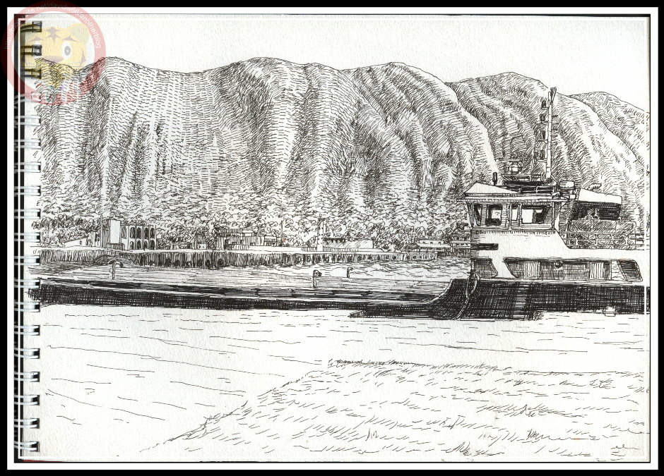 在大太陽底下速寫對眼睛很傷,尤其白色的紙面將陽光一五一十地反射進瞳孔,當然我沒這麼傻,沿著堤防尋找適合的地方,到最後才在旅客服務中心找到騎樓。由這裡望過去,剛巧是我喜歡的「第八幸福丸」,船、房子都容易處理,只需要耐心,老實地一筆一筆交代清楚。後面的山丘就麻煩了,總不能一片一片葉子的去數吧。我選擇以短線條來處理遠景,山腳下則以曲線解決,雖不滿意,但起碼該退後的畫面沒跑到前面來鬧。山,在當時短短的一、二個小時是處理不完的,我就用零碎的等待時間,一點一點補完,總是好過坐在那裡白白被太陽烤黑吧!
