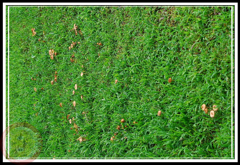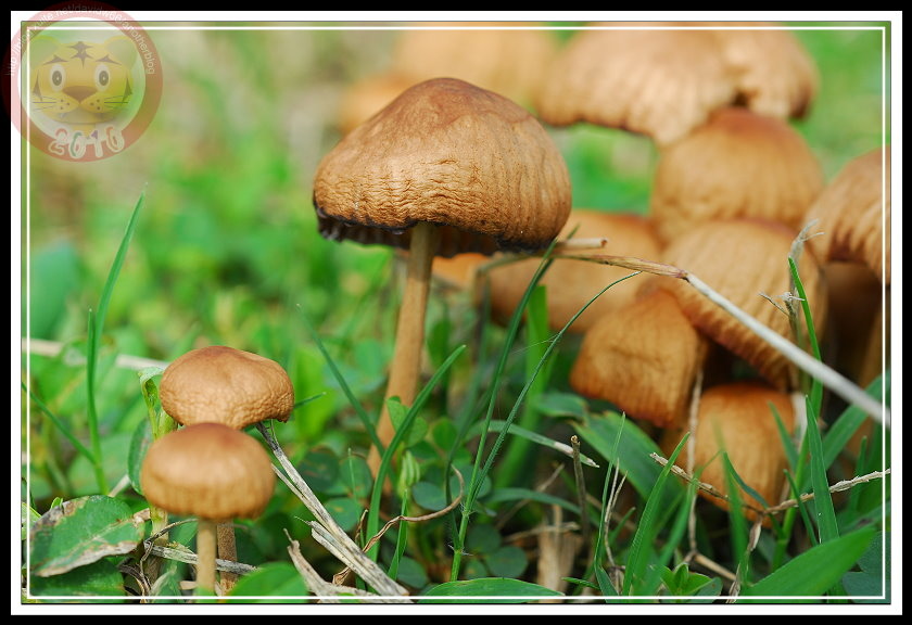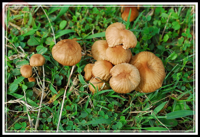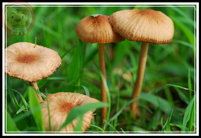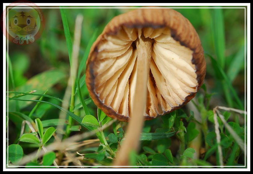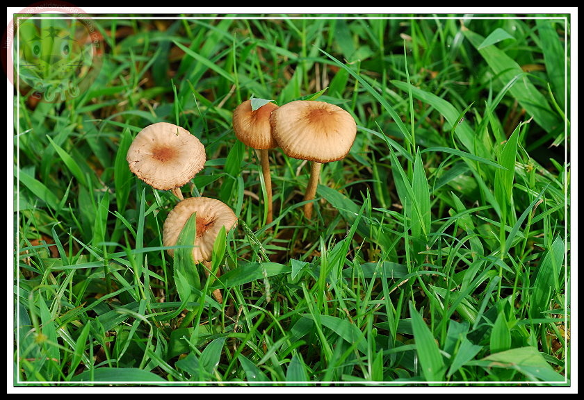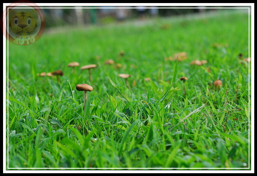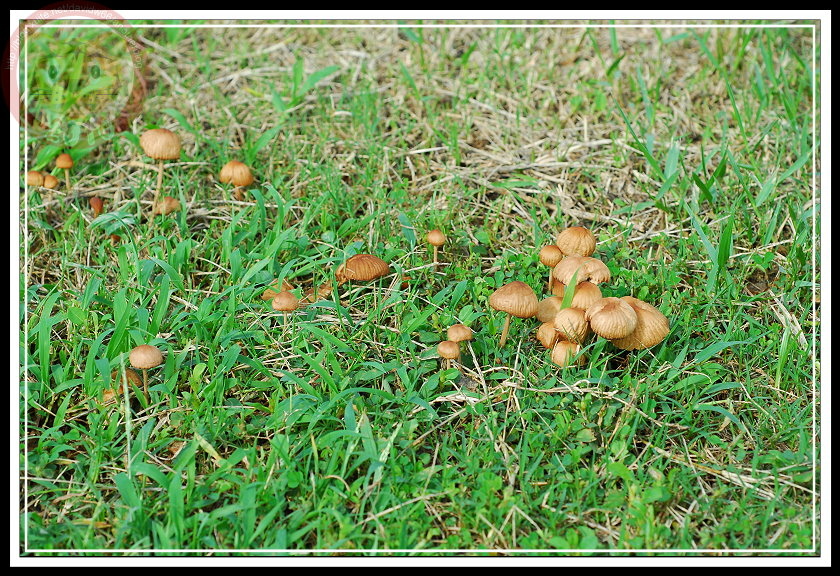 我也很希望他是香菇,質地有點像,留在手上的味道更像,可惜長相差那麼一點點,香菇的身高沒這麼高。周文能與張東柱寫的野菇圖鑑裡,最接近這模樣的就是「硬柄小皮傘」了,為了確定它是不是「硬柄」,早上我還特地去操場繞一圈,才過一晚,小皮傘都已經被踏得東倒西歪,哪有傘樣,倒是像極剁碎的肉粽餡。隨意找一株,果然菌柄不像磨菇那樣「肉質」,而是帶一點堅韌的觸感,也不容易拉斷;而我最後確認的理由是「硬柄小皮傘...炎夏時,在平地草地上偶爾可見群生的菇體....」雖然,操場上的沒有圍成美麗的仙女環,不過大體上算是錯落有致。至於圖鑑裡還說「氣味香濃,味道鮮美」...氣味有點像是香菇,味道我則不敢嘗試...不是我沒有神農嚐百草的勇氣,而是按照分類學...蕈類不算草,所以「就算了」。