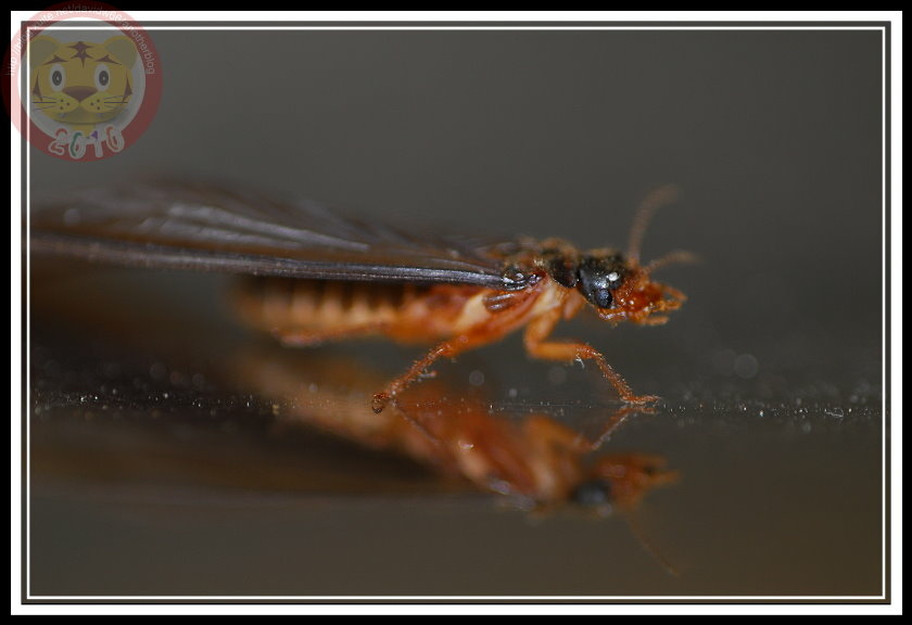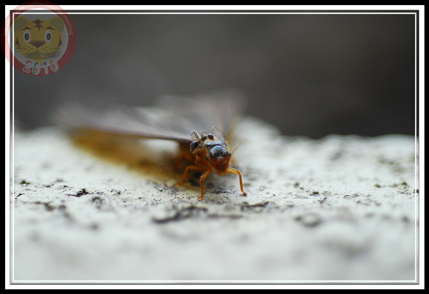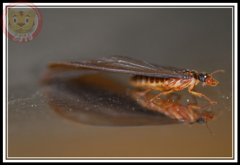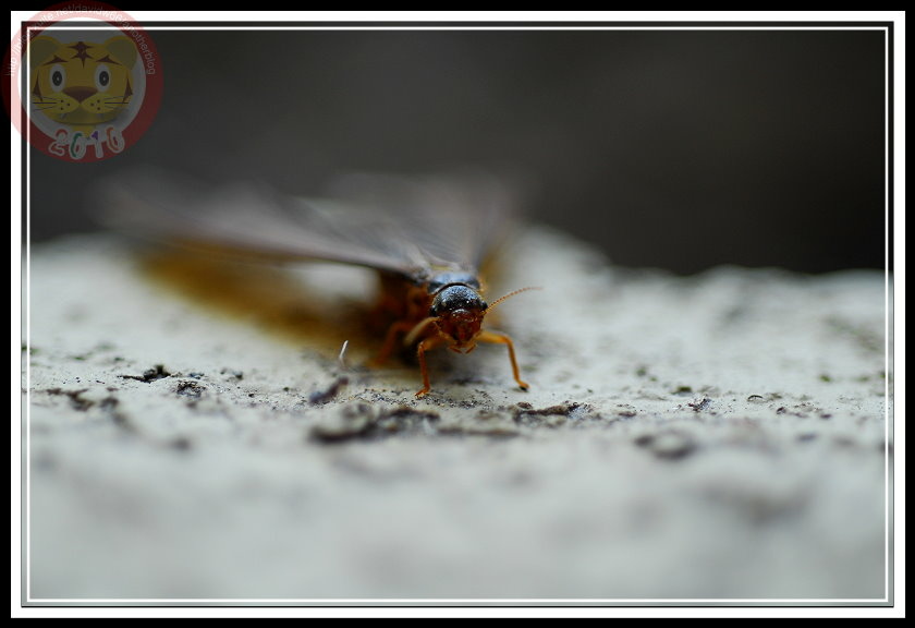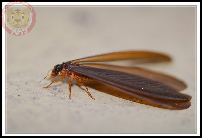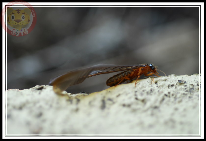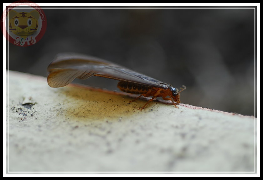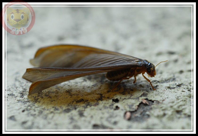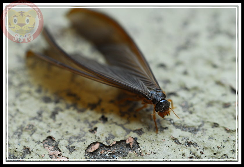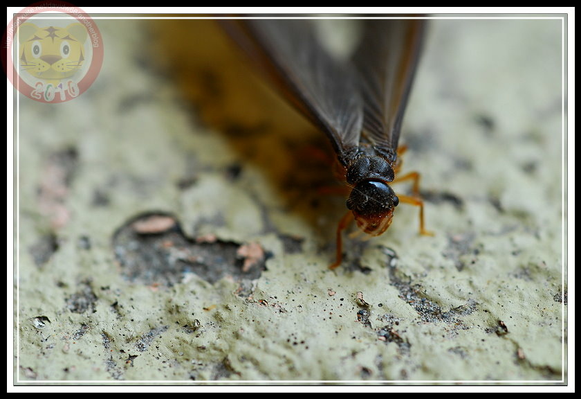 如果沒記錯,今年白蟻大發生有兩次,最後一次在五月底的雨夜裡。直覺上,在昏暗的燈光下,兩次的白蟻似乎有品種之分,第一次的較小;第二次的就是照片裡的大傢伙「黑翅土白蟻」。我不知道為什麼土白蟻的祖先要制定雨夜裡飛向黑暗的習性,在現代光電文明照耀之下,牠們當然可以穩穩地飛向窗戶,鑽過紗窗,在昂貴的木製家具裡築巢。也因此,只要白蟻大軍一出現,哨區警衛就會熱心地警告每一部回家的車子:「別開窗戶,有大水螞蟻。」只是,雨夜裡出發,白蟻也得損失不少。第二天的學校走廊,地板上就屍橫遍野,縱使有幾隻還活著,但也都因為華麗的翅膀被雨滴濺濕,或趴或仰被黏在磨石子地上苟延殘喘。等學生開始打掃、螞蟻開始覓食...這些白蟻都難以逃脫了。