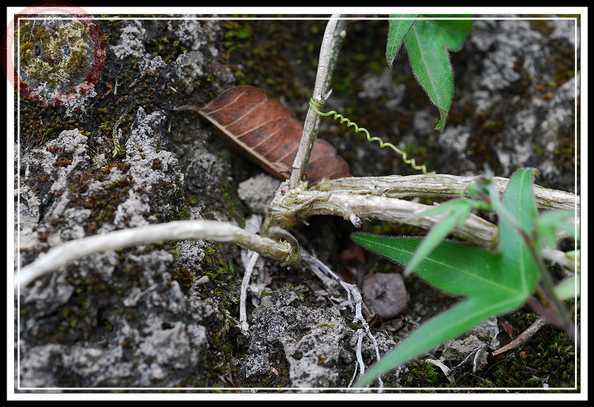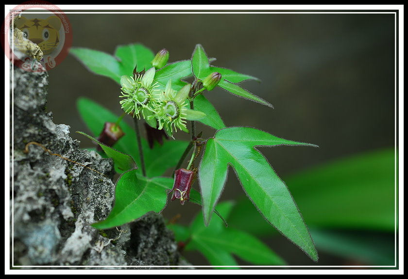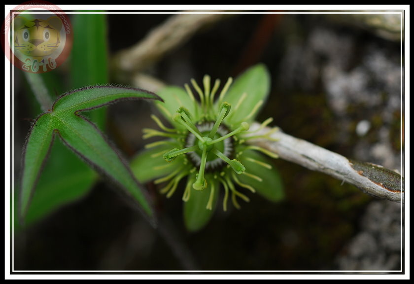 發現他的時候窩在校園一角的岩石上,沒多少土,老枝淺淺地攀住凹處少許的土壤,卻還是四處蔓延、開花且結了兩顆果實。三角葉西番蓮於1907年由日本人引進台灣,由於氣候適合現已馴化,而且因果實無實用價值,一般被視為雜草。不過,我覺得造型與百香果一樣特異的花朵實在具觀賞價值,等果子成熟應該可以摘回來播種,圍籬、柵欄上應該都是不錯的造景。