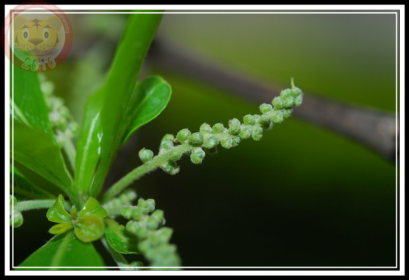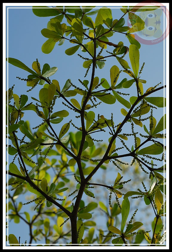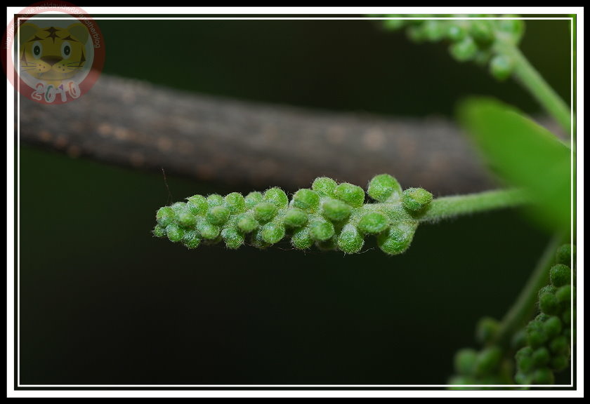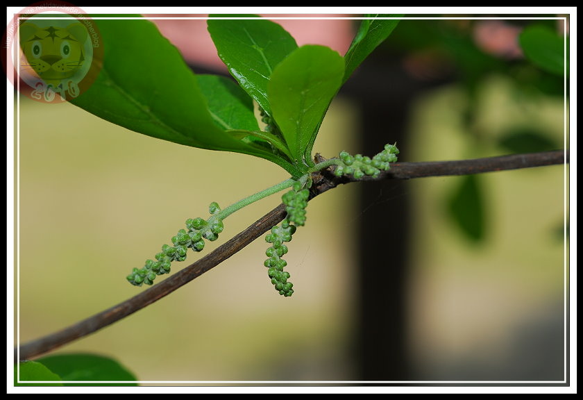 小葉欖仁的葉子還沒退去嫩綠,前幾天升旗時抬頭一看...咦?在陽光照射得到的枝椏分叉處好像多了一點東西,遠遠看上去像刷子,更像是掉光花瓣的花萼。忍不住爬上女兒牆湊近瞧個分明,果真是「花」,幾公分長的柄上依附著圓圓的小花,但那花圓球狀,是花嗎?