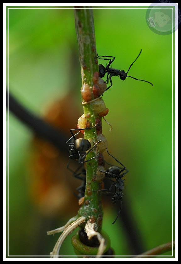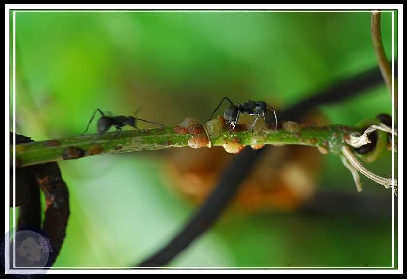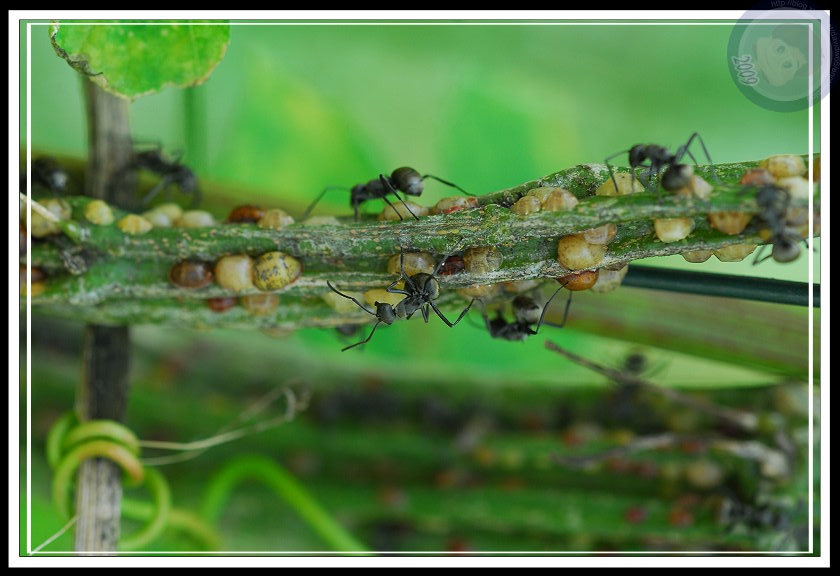 介殼蟲危害植物,終日抱著枝幹吸取養分,被附著的植物面黃肌瘦,像仙人掌之類甚者還會受感染而腐爛死亡。介殼蟲練就金鐘罩、鐵布衫有張硬殼護體,除了以油來覆蓋噴灑之外,大約只剩下「牙刷」和「手」能生功效。自然界裡,我唯一見過獵食介殼蟲就只有草蛉,草蛉的幼蟲叫做「芽獅」,終日背負著偽裝在植物上巡邏,遇見介殼蟲就用大螯將介殼蟲四腳朝天翻過來,吸或咬食介殼蟲軟的腹部。只是草蛉這種昆蟲無論成蟲或是若蟲就一副弱不禁風,別說農藥了,恐怕連天敵的種類都多到難以數計,很容易就被「消滅殆盡」。而介殼蟲也不是省油的燈,當然不乖乖地坐以待斃,他們以蜜汁聘請傭兵來防衛。家裡、花園螞蟻較弱小,抵禦外侮時還是堪用,流浪到其他植物的旅行委託小螞蟻來載運也還「使命必達」;野外的介殼蟲請來的螞蟻孔武有力多了,大山蟻攀附在山苦瓜藤來來回回巡視穿梭,雇主介殼蟲悠哉生活一副安逸癡肥。