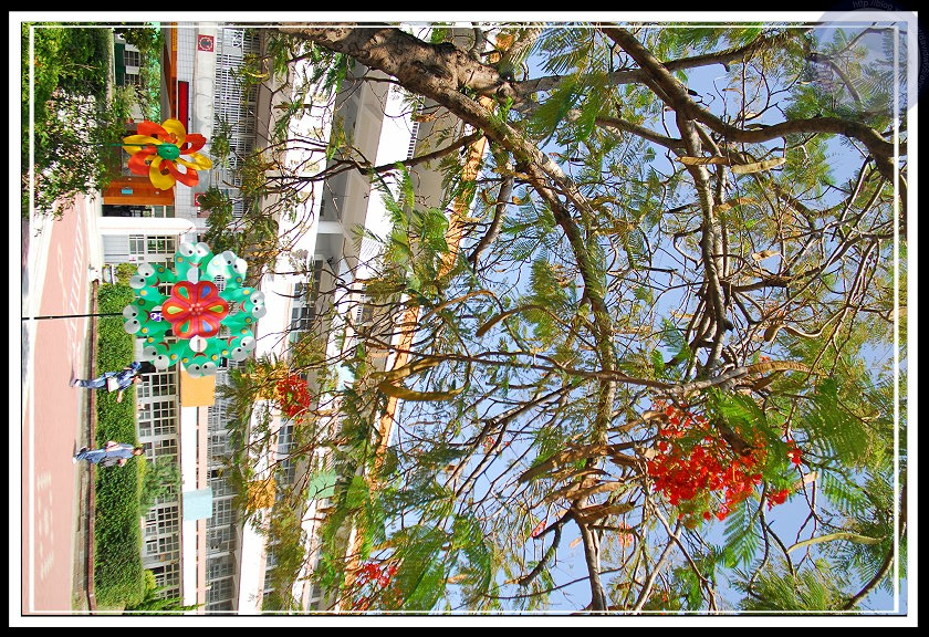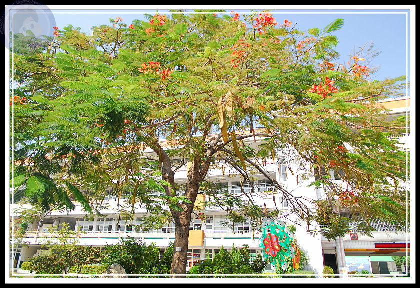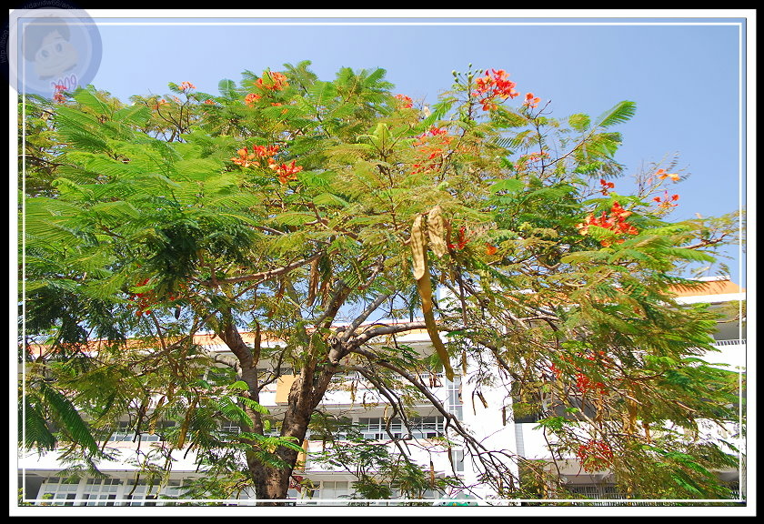 開了門,停車場轉角的鳳凰木引起我注意,十月中旬了,這棵鳳凰木還掛著花,而且從樹上的果莢看來,今年這裡曾有個熱鬧的鳳凰花季。而且,這棵鳳凰花在庭園絕佳的位置上,沒有建築物、大樹的干擾,看來每個面向都是欣賞的角度。其他地方,像是大度山、東北街、校園...都不乏十月猶開著花的鳳凰木,但獲多或少都因為日照、環境因素,造致明顯地半邊開花。