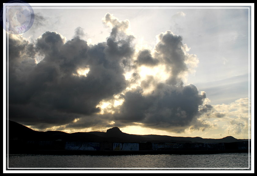 你知道嗎?上面這兩張照片之間又過了25分鐘,長時間在海上航行的人可真有耐心。船並沒有朝著開元港直駛,而是對準紅頭山前進,蘭嶼頭頂著烏雲大帽子與太陽歡迎我們,逆光黑鴉鴉的島嶼帶著神秘,忽然「侏儸紀公園」的電影場景閃過念頭。只不過在碼頭上歡迎我們的不是迅猛龍,是一部部閃著亮光的摩托車。