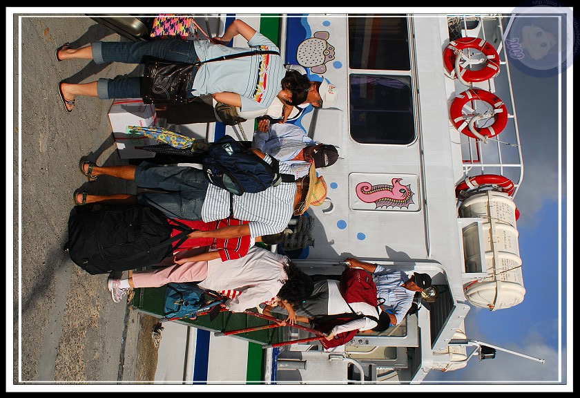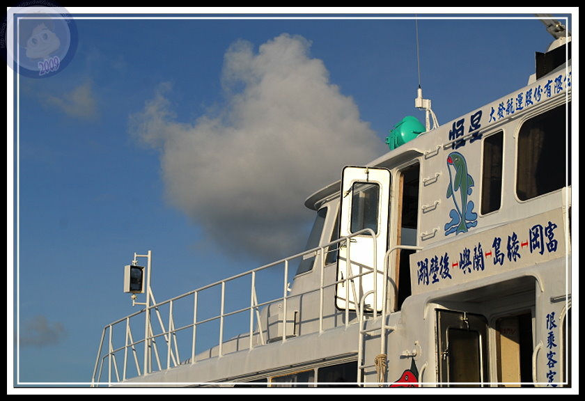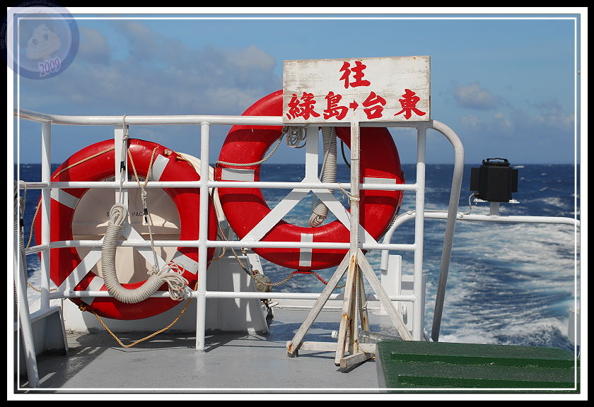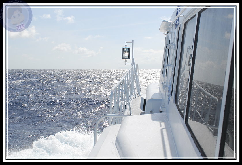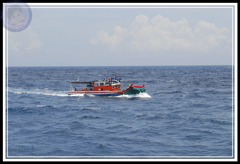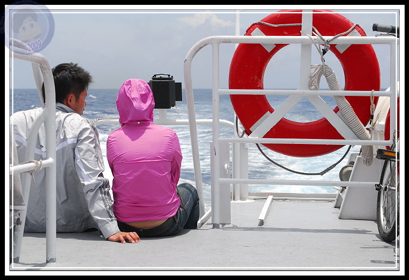 回程,我們慢了,因為記錯時間足足讓船等了半個鐘頭,還好租機車的老闆在碼頭硬是看著船不讓出發。星期天多了一日來回的遊客,大部分的旅客也在這一天回台灣,船上好些熟面孔,應該是同一班船到蘭嶼。下午船班客滿,我們也只好遷就在上午打道回台灣。船上座無虛席,慢上船也只佔到船頭座位,當然放完行李,拎著相機還是去「頭等艙」曬太陽、吹海風。