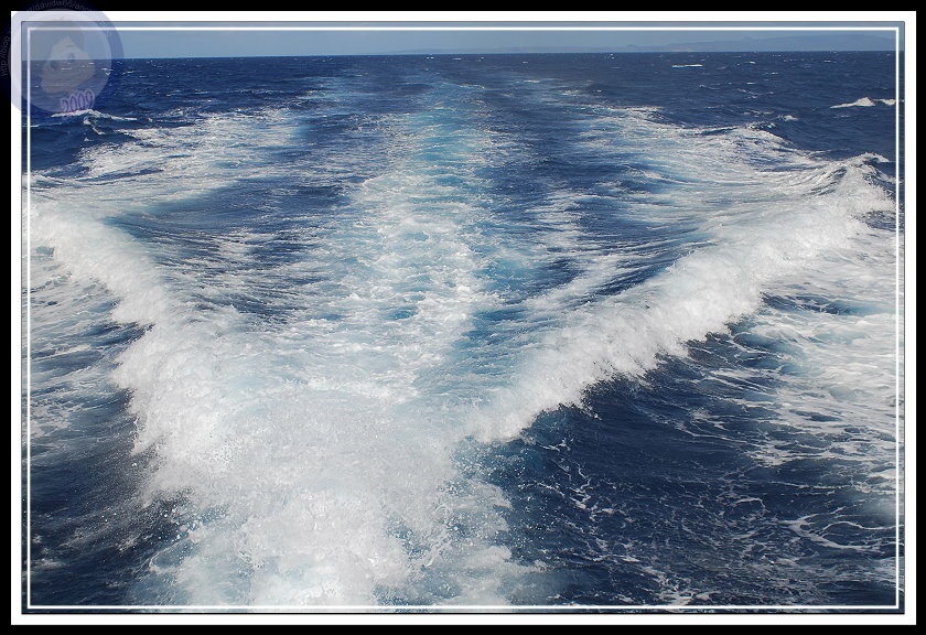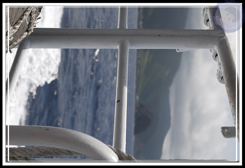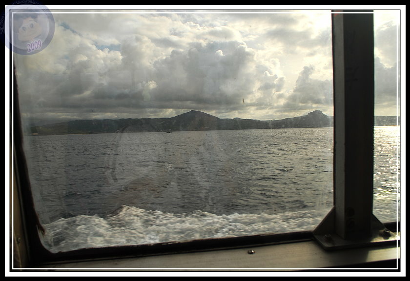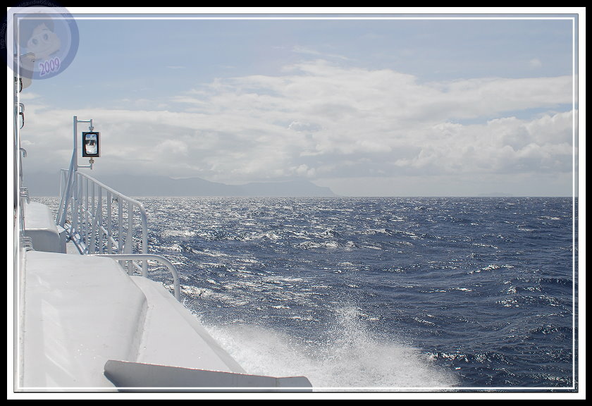 出了外海,就像逛大觀園,我開始在船艙裡尋找新鮮的事物,總不能花了船票錢又任由他晃2.5小時。上船的後門貼著「航行中請勿外出」,而且有船員把守著,所以上樓梯道上層船艙,比起下船艙的柴油味,空氣清新許多。這裡通往外頭艙門半掩,且外面有幾個人抽菸...就當作我也抽菸吧!硬著頭皮走出門,與他們點點頭,外面的空氣更適中,船艙裡令人頭暈腦脹的感覺頓失,這才是頭等艙,有清新的空氣與絕佳的視野。