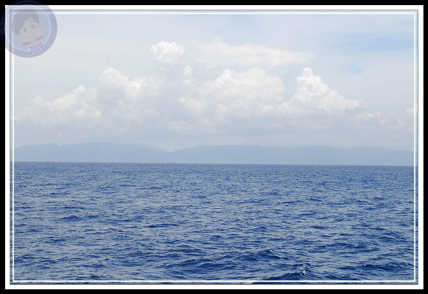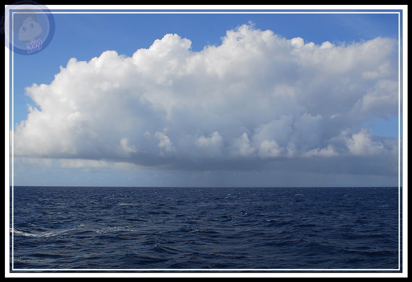 回頭望台灣島,從龐然大物直變成海平線上模糊的島影足足花了一個半小時。太平洋上,天氣終於轉晴,陽光曬在甲板上又叫人埋怨天氣太好。南邊的天空積著濃濃的雲,有陸地的地方才有積雨雲吧,那應該是菲律賓...我是這麼猜測。