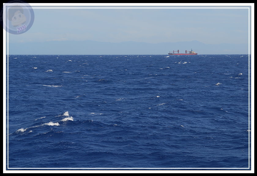 這次搭船才發現:船有後視鏡,但是用來看追船的嗎?還是進港倒船?我從船尾看去剛好看見駕駛室的擋風玻璃,可惜距離遙遠,不知道船長是不是與我四目相接呢?這天的太平洋很安靜,轉出鵝鸞鼻之後就沒見到漁船,寬闊的海天就任由這艘交通船航行,東部的國際航線似乎少有船隻,等了老半天就只有一隻貨輪在海平線上跟我們交錯。