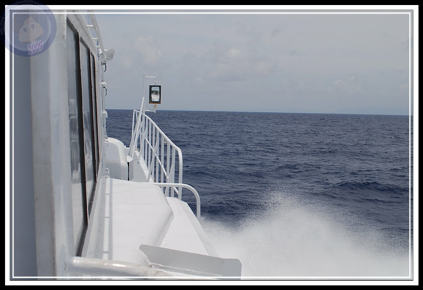 船才離岸就開始晃,幸好早上船佔了接近船尾的位置,據說船頭頂浪是最晃的地方,船艉則是接近擺動的軸心,怕暈船的還是穩坐船艉。我曾經在後壁湖搭過玻璃船,知道出了港船會更晃,但行駛當中還好,怕是船停了跟著波濤晃蕩,那一次真差點就掛了。出港,船必須穿越南灣,繞過鵝鸞鼻,看見燈塔之後潮水更加洶湧,這才知道南灣的水還算客氣。轉過海岬失卻台灣島的屏障,船更晃了,而且光到太平洋就需半小時的路程。