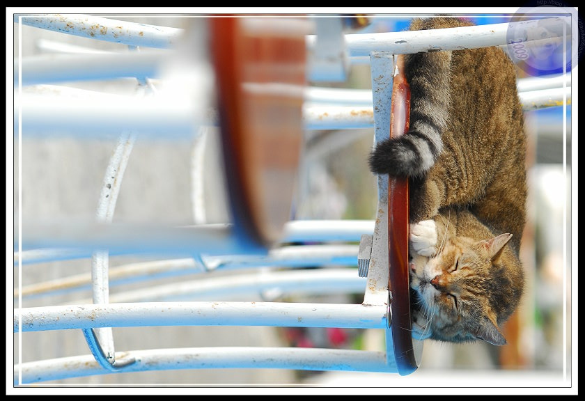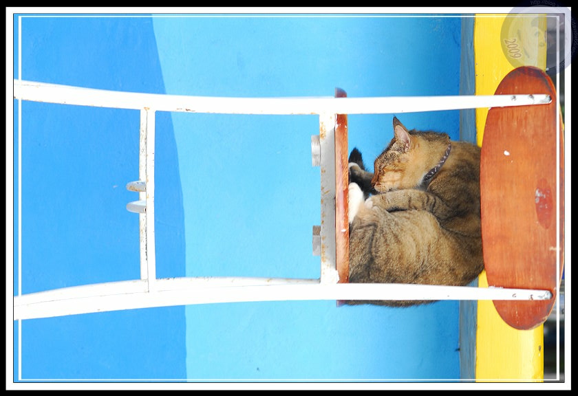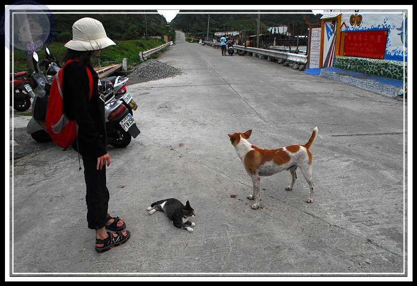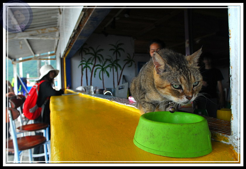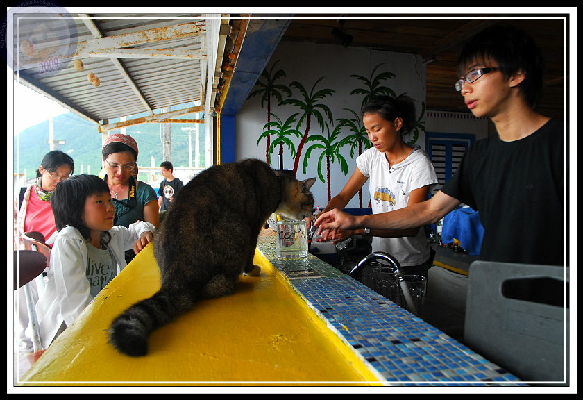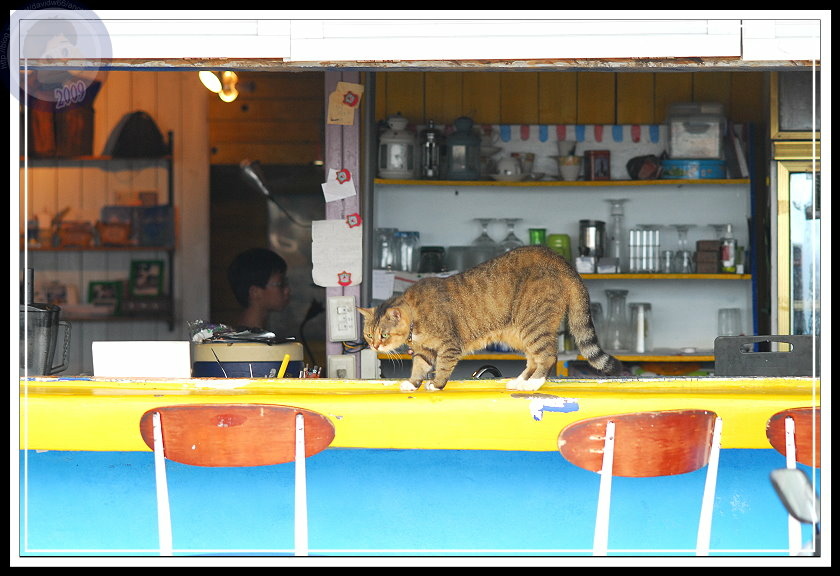 兩隻年輕的貓在路邊嫌晃,無視機車、小狗...甚至躺到路中間睡覺。老貓則盤據櫃檯當招牌,懶洋洋、幸福地吃著貓食,渴了伸伸懶腰踱到櫃檯中間喝老闆娘準備裝在寫有「Cat」玻璃杯的水。沒事做就盯著店員一杯一背遞過櫃檯的冰沙,我想蘭嶼觀光客多不多?問他鐵定有個數。看累了,趁著空檔僅佔張高腳椅呼嚕呼嚕去,這老貓比起年輕小貓幸福多了,顯然櫃檯算牠的地盤。