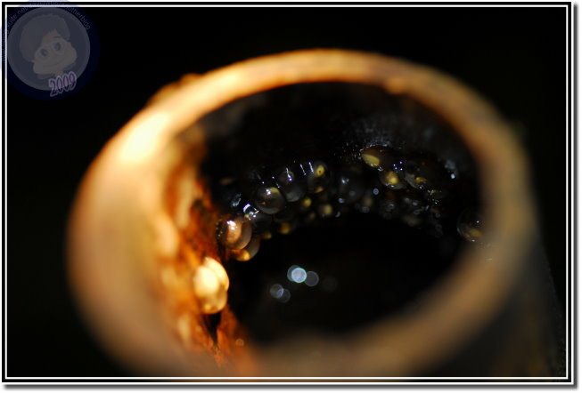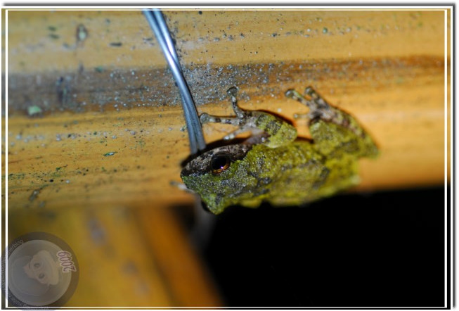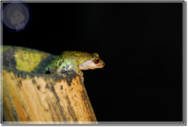 這次來,竹籬笆換新了,筒子裡蓄滿水,雖然大部分的竹筒養滿孑孓,到傍晚、甚至光線較昏暗的中午就可以見到艾氏樹蛙探頭探腦地在筒頭觀望。入夜後,周圍的竹林傳來悅耳的蛙鳴,不過實在比不上竹籬笆裡的清亮。艾氏樹蛙似乎喜愛竹節較長,蓄水較深的竹筒,雄蛙盤據著鳴叫的是新進駐的;裡頭有蛙卻安安靜靜的,通常可以看見粉圓般的蛙卵就附著在水線上的筒壁。這時候,除非將樹蛙請出來「檢查」才知道是雄蛙?還是雌蛙?不過樹蛙總是機警,任何輕觸竹籬笆的舉動都會引起騷動。他先是退回桶子裡,露出大眼睛觀察;若是步步進逼,往往「撲通!」一聲不見蛙蹤。