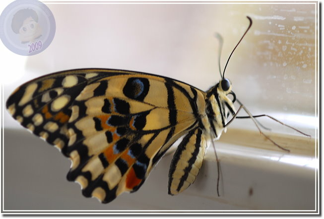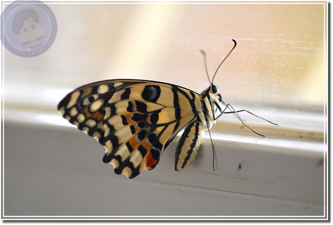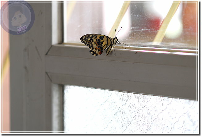 學校辦畢業典禮,牠們也要跟著畢業。同事們送完孩子出校門,進到辦公室,這隻無尾鳳蝶不知從那兒出現停在窗框上?是不是阿賓老師前幾天失蹤的那兩條幼蟲羽化?該不會孩子畢業了,蝴蝶也要跟著畢業;還是畢業的孩子就樣羽化的蝴蝶,一樣地翩翩飛舞。