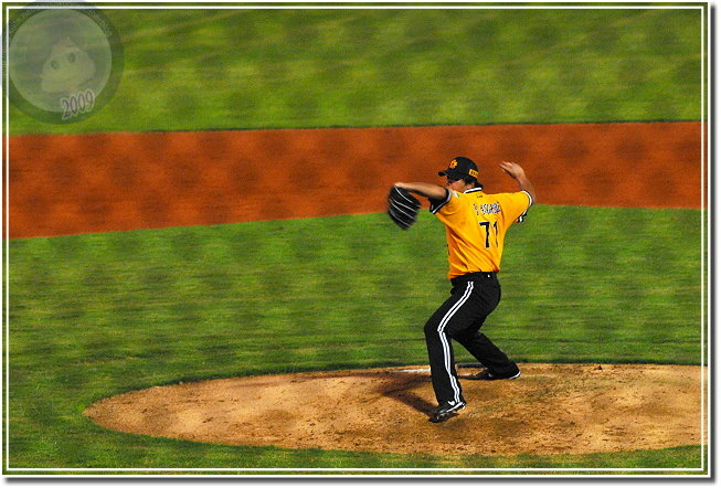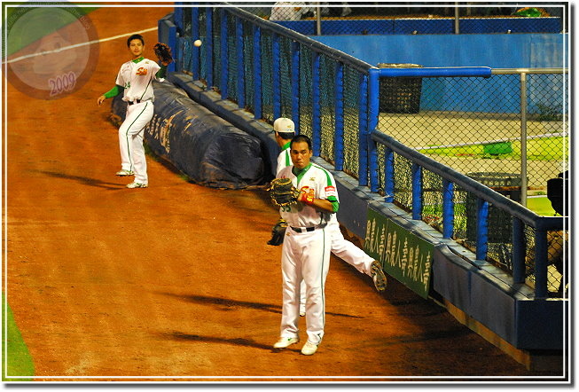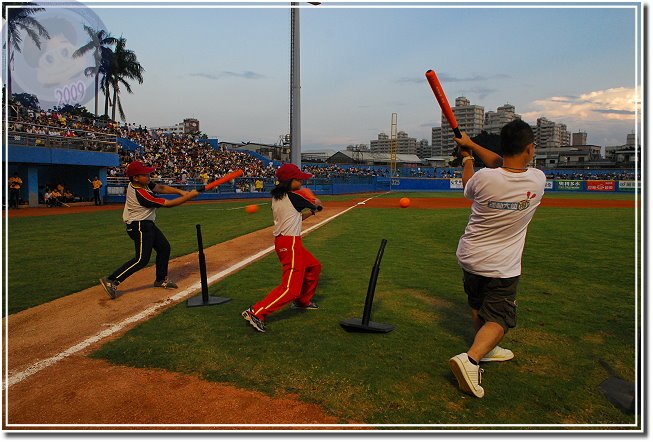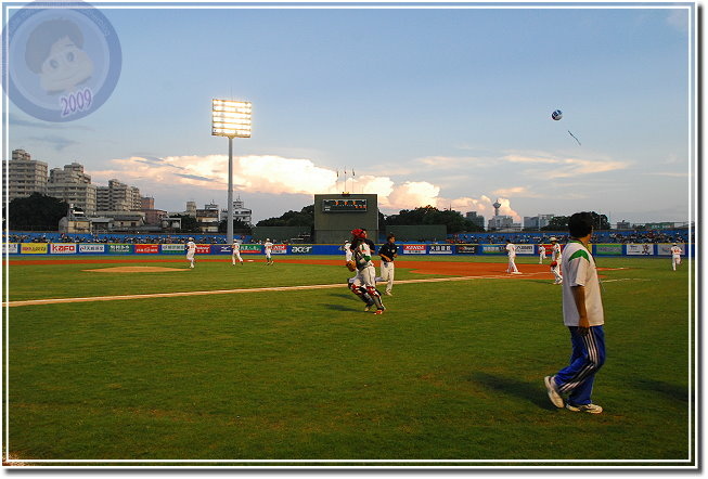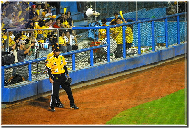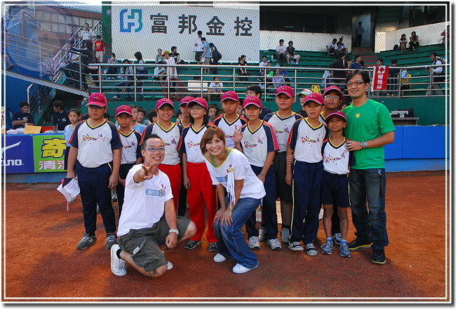 這輩子沒進過棒球場,當然要藉機會跟一跟,一行人連球員帶家屬、教練們...與家屬浩浩蕩蕩開赴台中棒球場。這一戰是兄弟象對上興農牛,開幕之前就由我們家小朋友與第一名學校的小朋友接受頒獎,然後與「運動大使」一齊開球。而我就沾小朋友與全隊最佳相機的光環,有幸進到球場去「幫忙拍照」,除了不辱使命帶回應有的影像,趁機會拍了幾張「職業比賽中進入球場」的珍貴鏡頭,我想:看過職棒的人多,真正踏進球場的人可稀罕了吧。這可是難得且值得分享的經驗喔....。