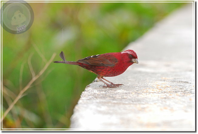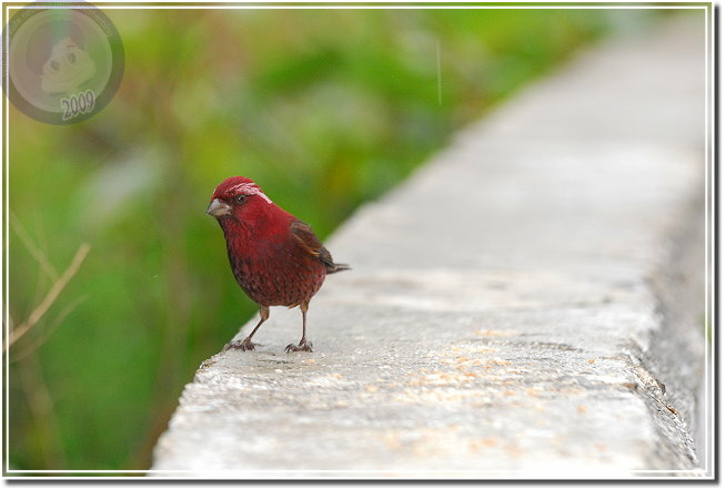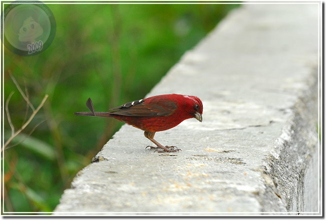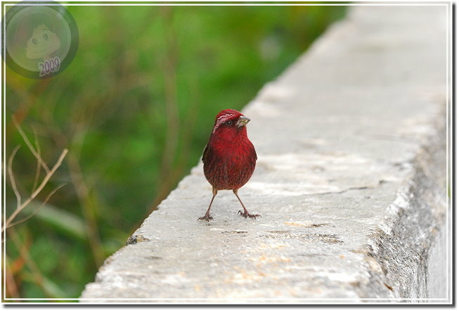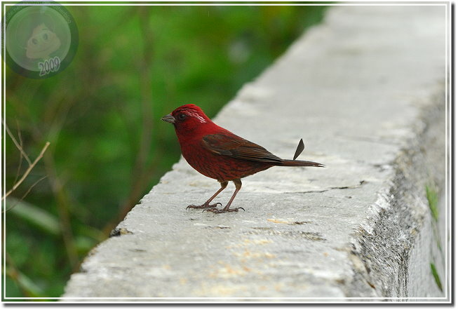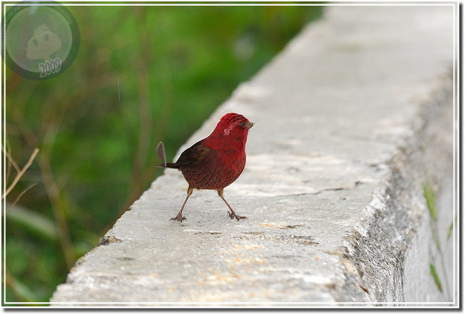 才狐疑這雌鳥怎麼落單?就看見這雄鳥跑來跟金翼白眉搶餅乾屑,全身酒紅,眼上一道白眉,一副花枝招展模樣。酒紅朱雀和金翼白眉在這裡似乎都越來越接近人類的趨勢,這一隻接受餵食;上一次在昆陽停車場,也發現一對在翻找攤販的垃圾桶。