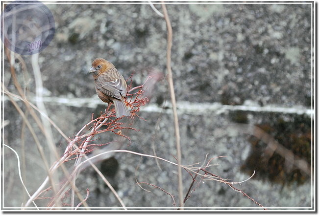 拍金翼白眉的時候,有隻酒紅朱雀的雌鳥就在附近活動,雌鳥不似雄鳥這麼豔麗,長得像山腳下的麻雀親戚。比起金翼白眉的體型,酒紅朱雀就顯得嬌小許多,為了追逐擅長躲藏在草叢的雌鳥,還差點一腳踩進滑雪山莊的化糞池,幸好動作快、身手還算敏捷。