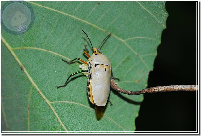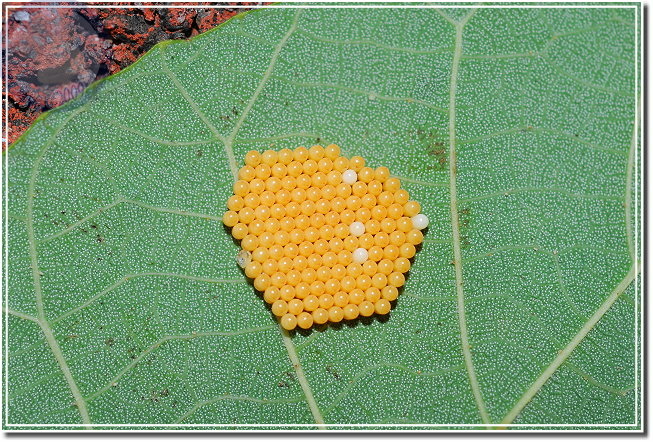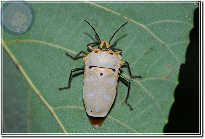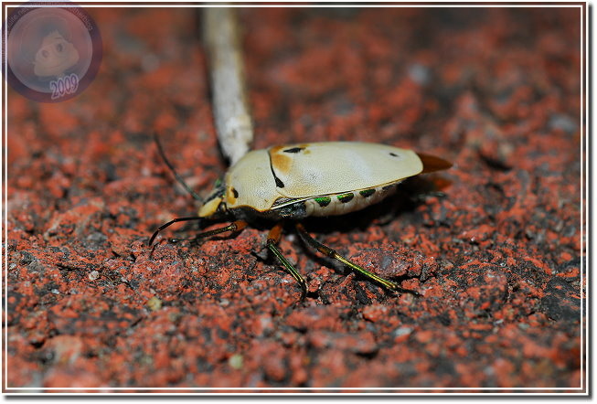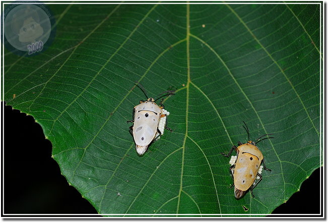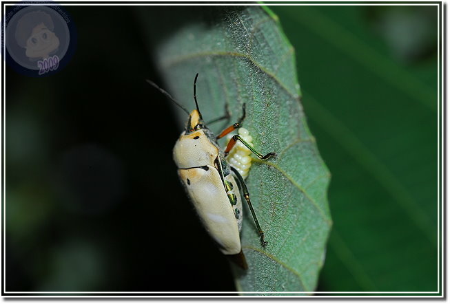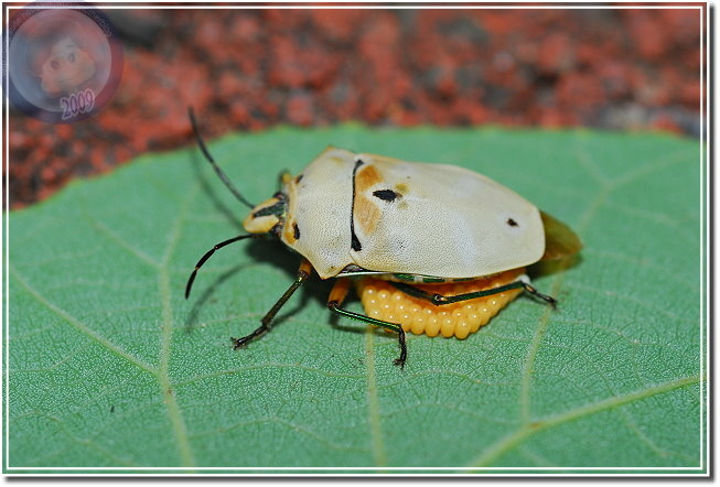 山上的白匏子葉子上停了好多黃盾背椿象,原以為靠近後會四散奔逃,卻在閃光燈閃了多閃之後還是不動如山,仔細一瞧,每隻黃盾背椿象的腹部底下或多或少都有一些蟲卵。原來是母椿象正在產卵,拿枝小樹枝想請她讓點路,拍一下椿象媽媽的好功夫...排列得像是國慶閱兵阿兵哥排成的方陣一樣,又像是數學課的矩陣。可是當樹枝靠近椿象左邊,他就向左邊頂出來;換到右邊,他又向右擋,稍施一點力,樹枝竟傳回椿象媽媽奮力抵擋的力道。原來椿象媽媽不是在產卵,原地不動是為了保護自己的小寶寶。忽然想到,母椿象真得認得自己的卵嗎?我和兒子決定找隻椿象媽媽開開玩笑。我們硬是將一隻椿象媽媽蟲卵堆上請到百碎磚上,再用樹枝撥撥看,果然椿象媽媽還是一樣奮力地抵擋,左邊、右邊屢試不爽,可是她的肚子底下沒有蟲卵啊?看來,應該是椿象媽媽產完卵,身體系統自然地就安排她靜靜地待在卵群上,完美地完成傳宗接代的天命吧!